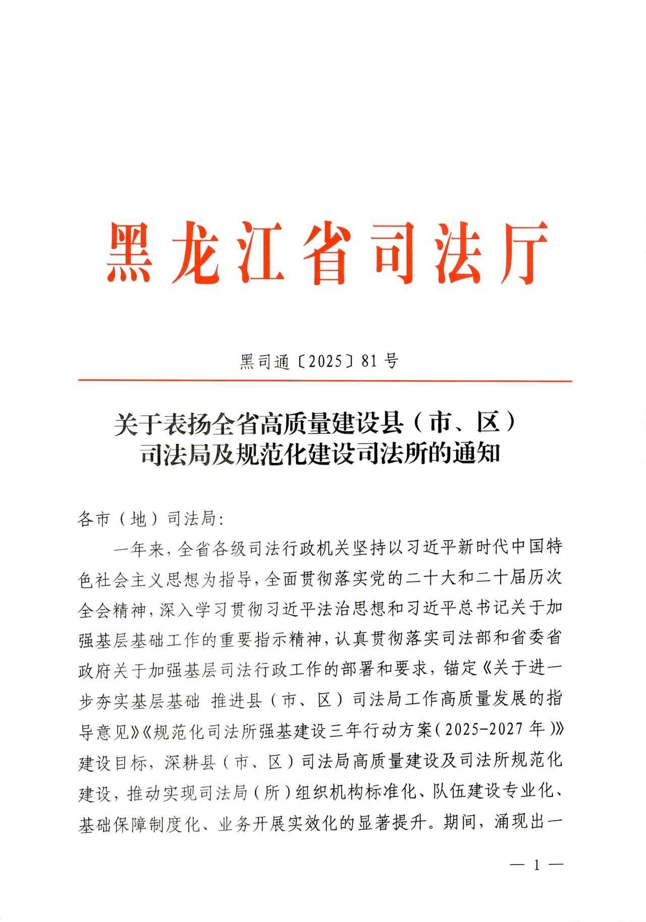 日前,经申报评审,松北区司法局荣获“全省高质量建设区、县(市)司法局”,松浦司法所、对青山司法所、利民司法所荣获“省级规范化司法所”称号。