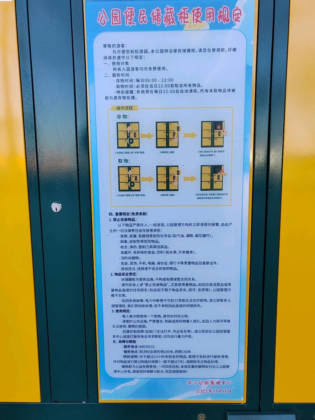 此次新增的自助储物柜以“便捷化、智能化”为核心,多数设备搭载人脸识别系统,市民游客仅需通过面部核验即可快速完成存物、取物操作,无需额外携带凭证,操作高效简便,大幅节省使用时间。在点位布局上,充分贴合游客实际需求,均选址公园核心区域,涵盖游客中心、志愿服务站、休闲区等高频活动场所,精准匹配寄存使用场景。