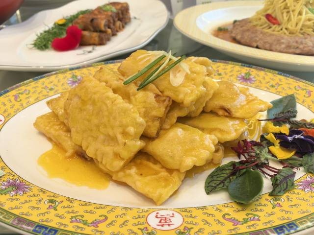 59名黑龙江名厨用西牛麻竹笋与黑土优品碰撞新型融合东北菜。图为用西牛麻竹笋做的东北“锅包笋”。