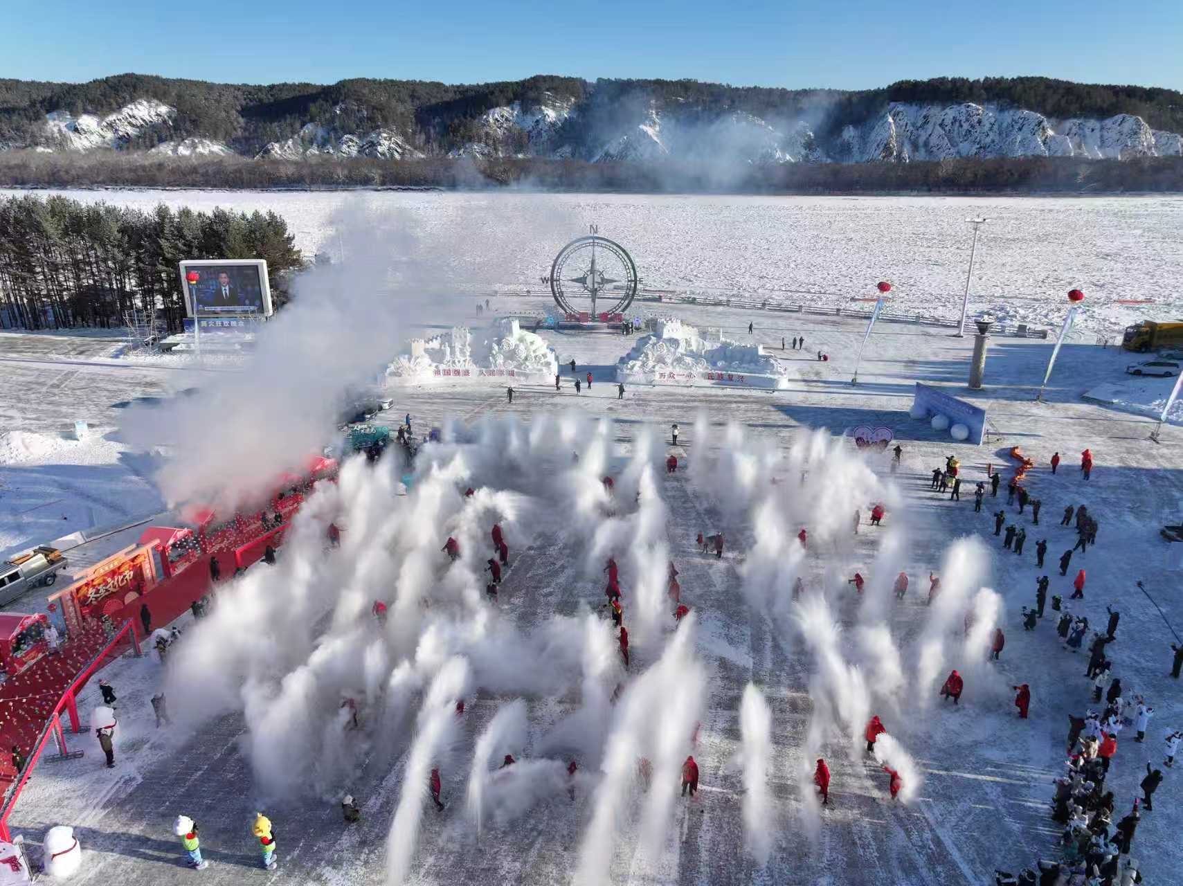 七星广场上,备受期待的“极寒奇观秀”在七星广场震撼上演,身披红斗篷的居民和游客组成一个巨大的“北”字造型,随着指令下达,他们同步将滚烫的热水向空中泼洒,在零下三十多摄氏度的极寒空气中瞬间凝结成漫天冰晶,银絮纷飞、弧线交织、光影交错,构成一幅壮阔的极地冰雪画卷。现场快门声此起彼伏,大家纷纷用镜头记录这个奇幻瞬间,来自河南的游客李佳璐感慨:“第一次来到漠河参加泼水成冰的活动,看见这么多人泼水成冰,特别震撼。”