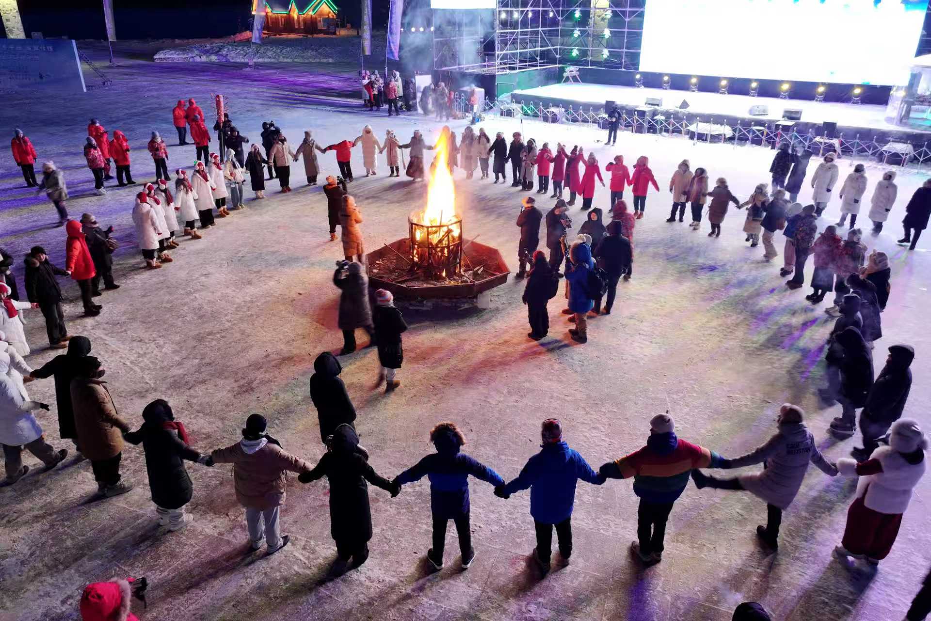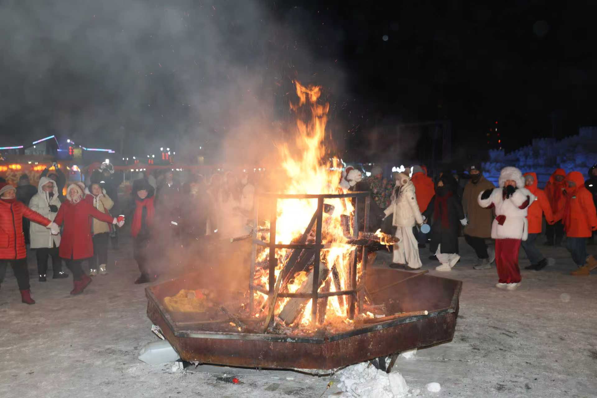 夜幕降临,篝火熊熊燃起,绚烂的烟花在七星广场江面上空绽放,现场欢呼声四起,居民和游客围着篝火载歌载舞,在极寒夜色中感受“冰火两重天”的独特体验。“虽然天气很冷,但玩得特别开心,越跳越嗨,在篝火旁跳得全身都热起来了。”辽宁游客付女士说。