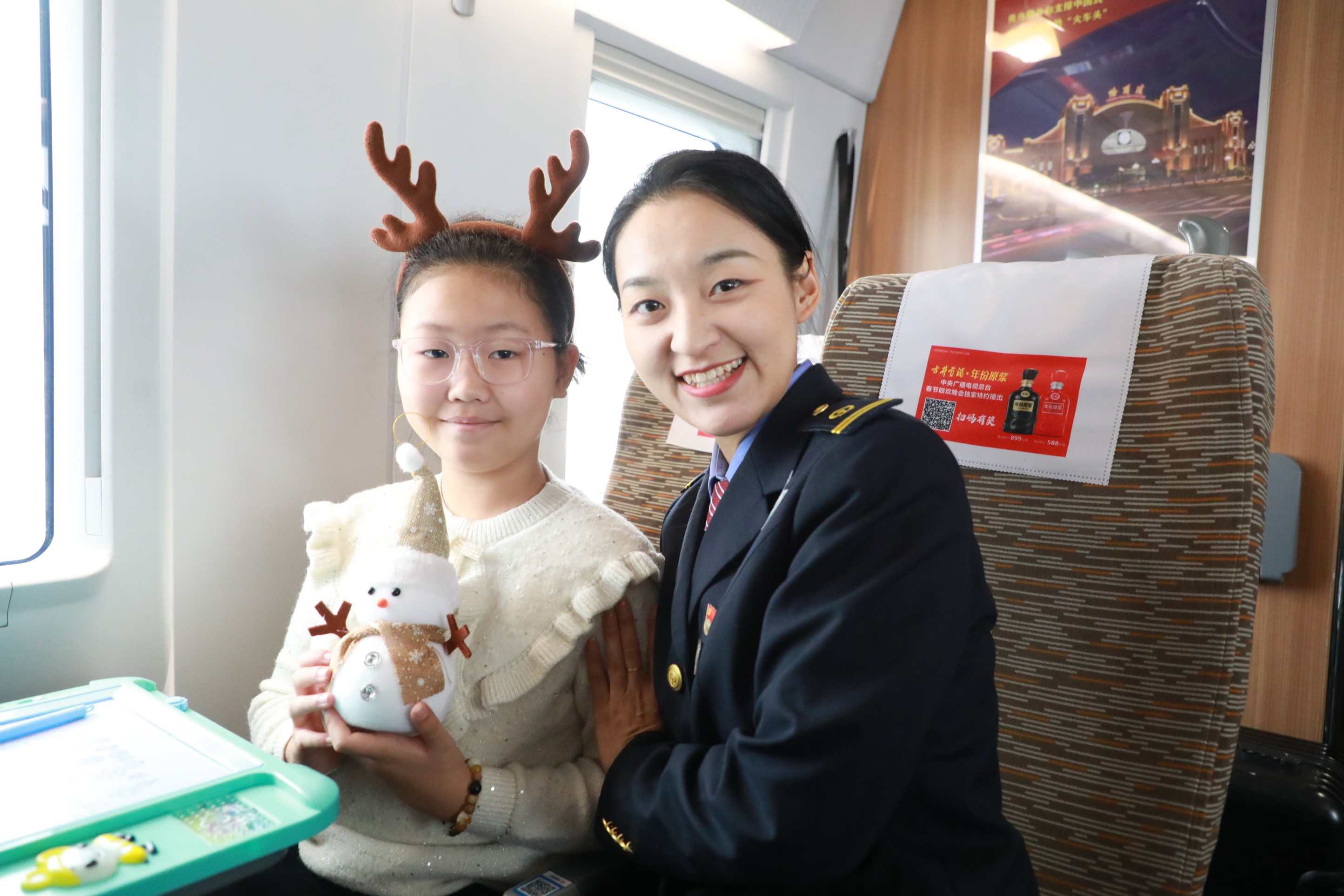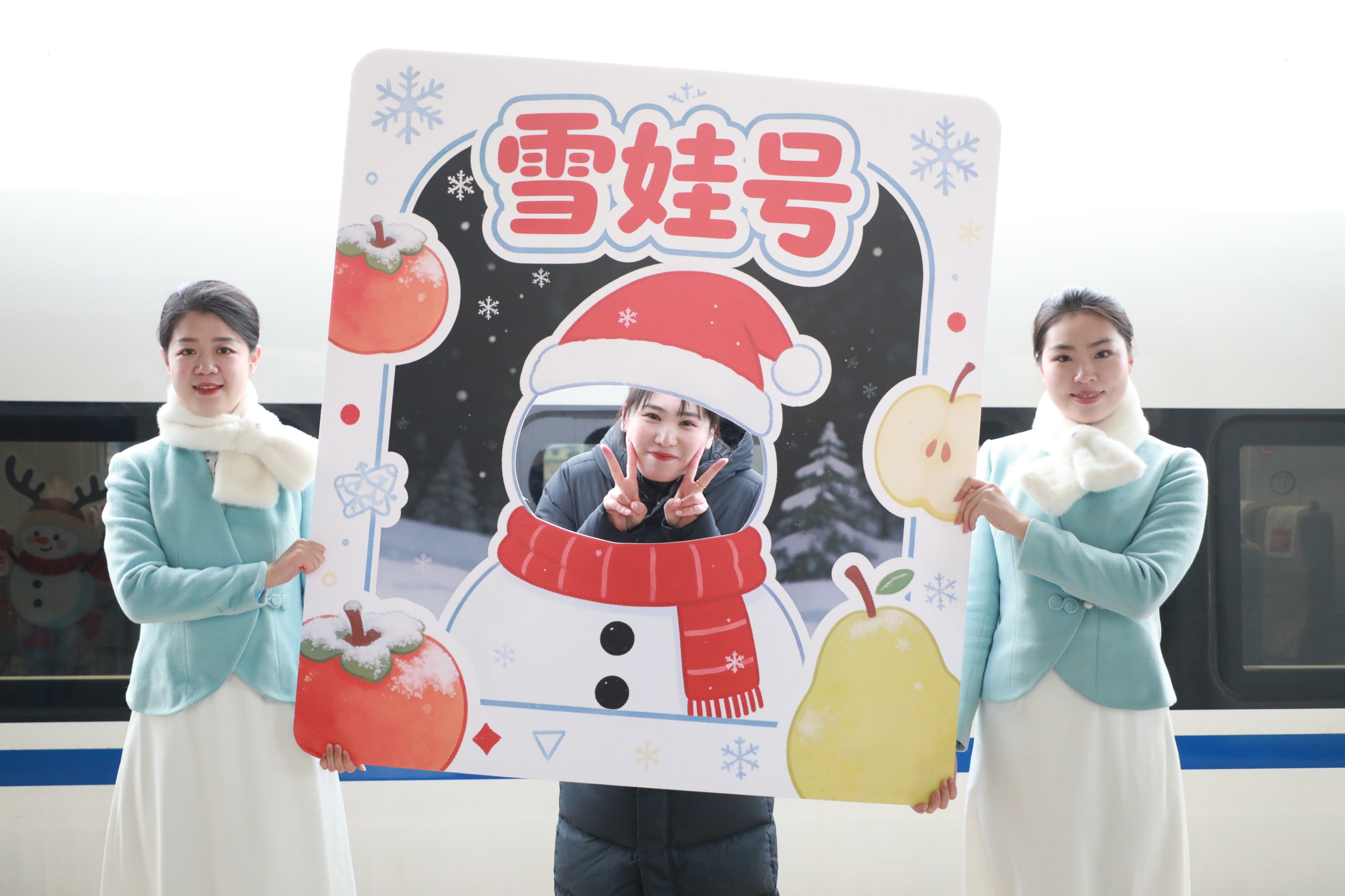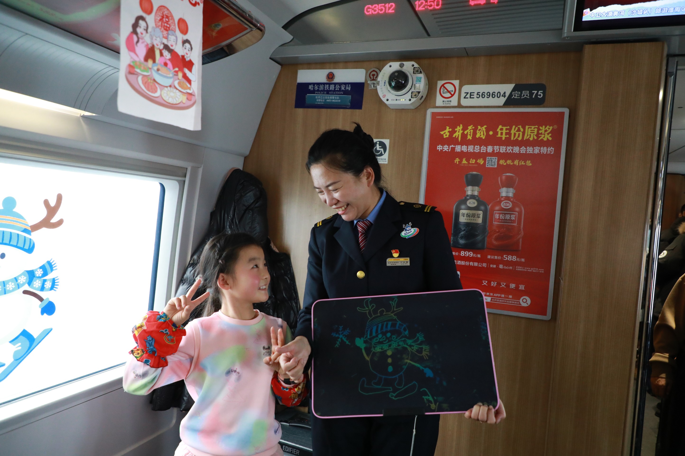 列车途中列车工作人员为旅客送上冻梨、冻柿子等特色食品,“冰雪知识大闯关”融合龙江冰雪文化与高铁常识,吸引旅客积极参与,旅客还可分享“我与高铁的故事”。此外,京胡、竹笛演奏及手语礼仪表演等节目穿插其间,使车厢成为移动的“文化体验空间”。