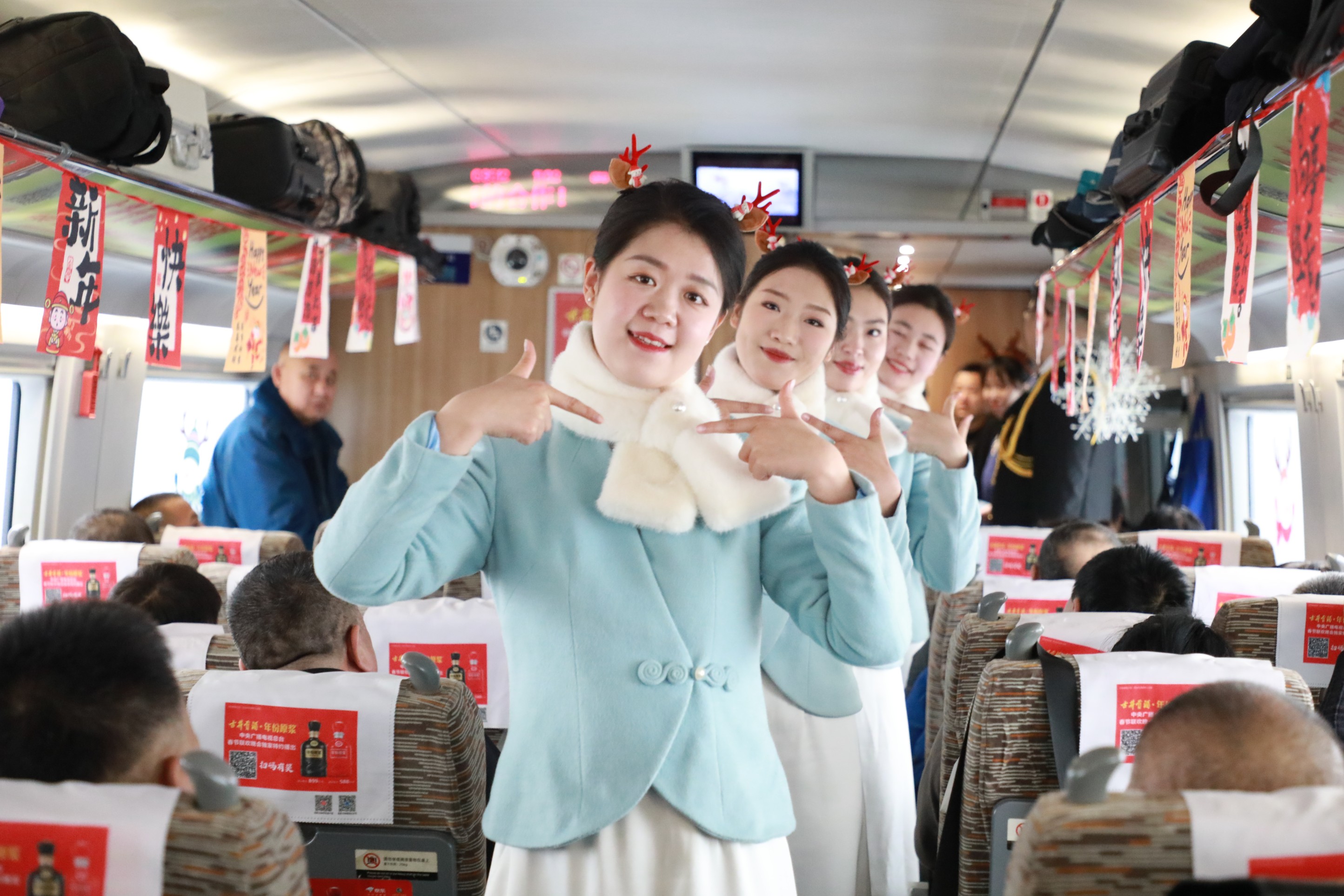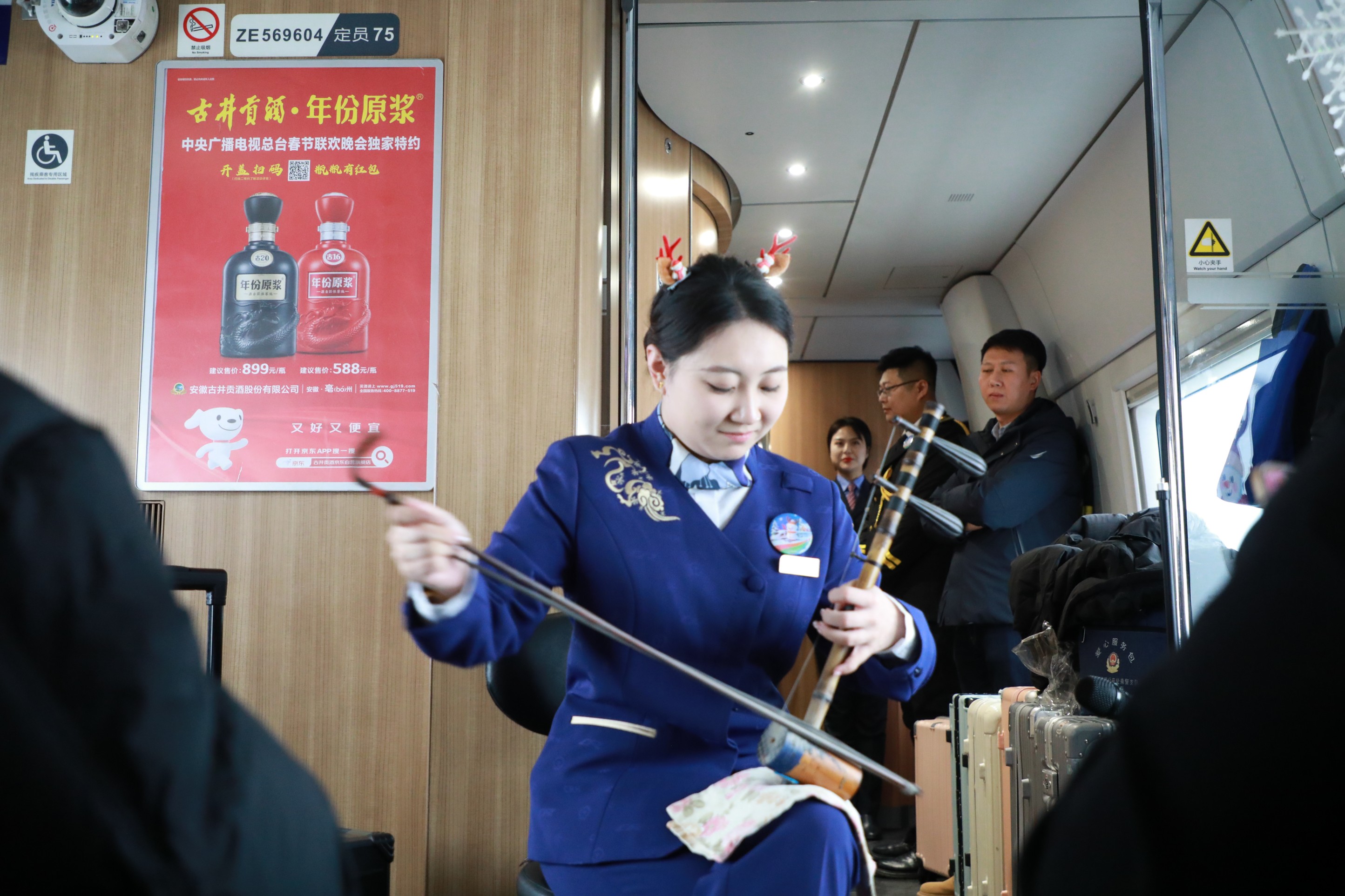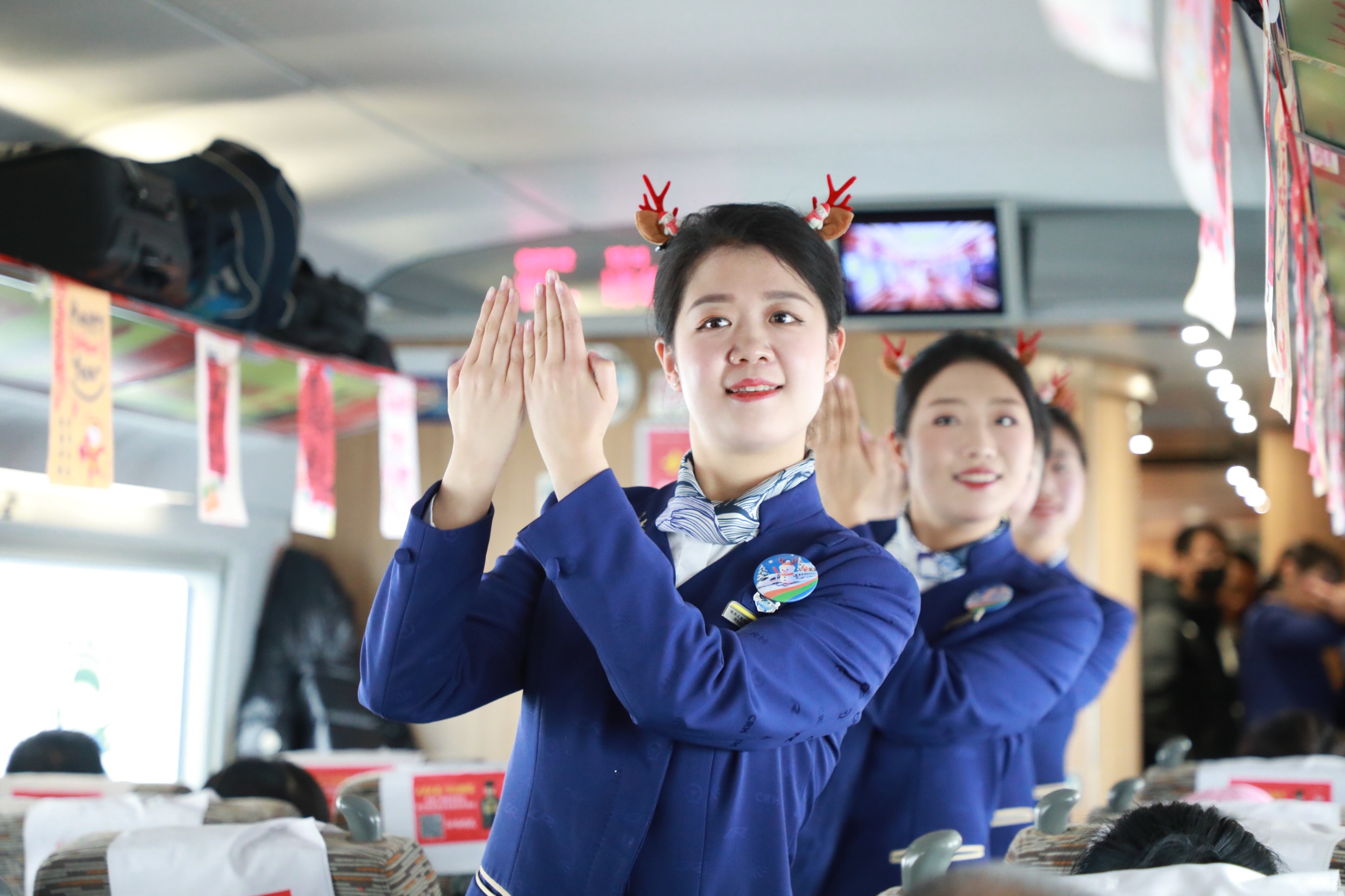 列车途中列车工作人员为旅客送上冻梨、冻柿子等特色食品,“冰雪知识大闯关”融合龙江冰雪文化与高铁常识,吸引旅客积极参与,旅客还可分享“我与高铁的故事”。此外,京胡、竹笛演奏及手语礼仪表演等节目穿插其间,使车厢成为移动的“文化体验空间”。