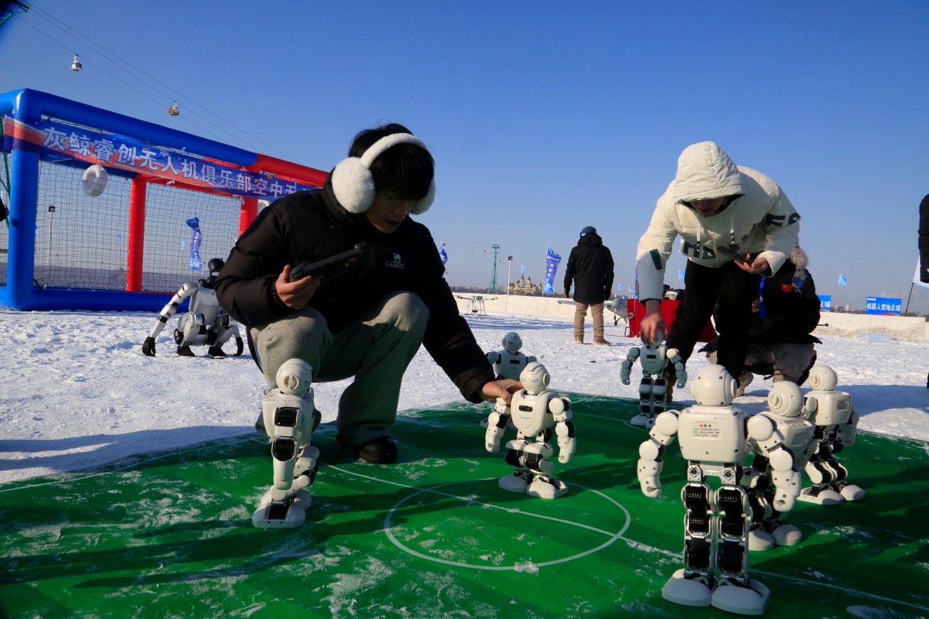在智慧冰雪互动区,机器人足球赛和无人机足球赛是最大亮点。智能机器人在冰面上灵活穿梭,完成带球、传球、射门等动作;无人机在特制笼球内展开激烈攻防,展现科技与体育的完美融合。