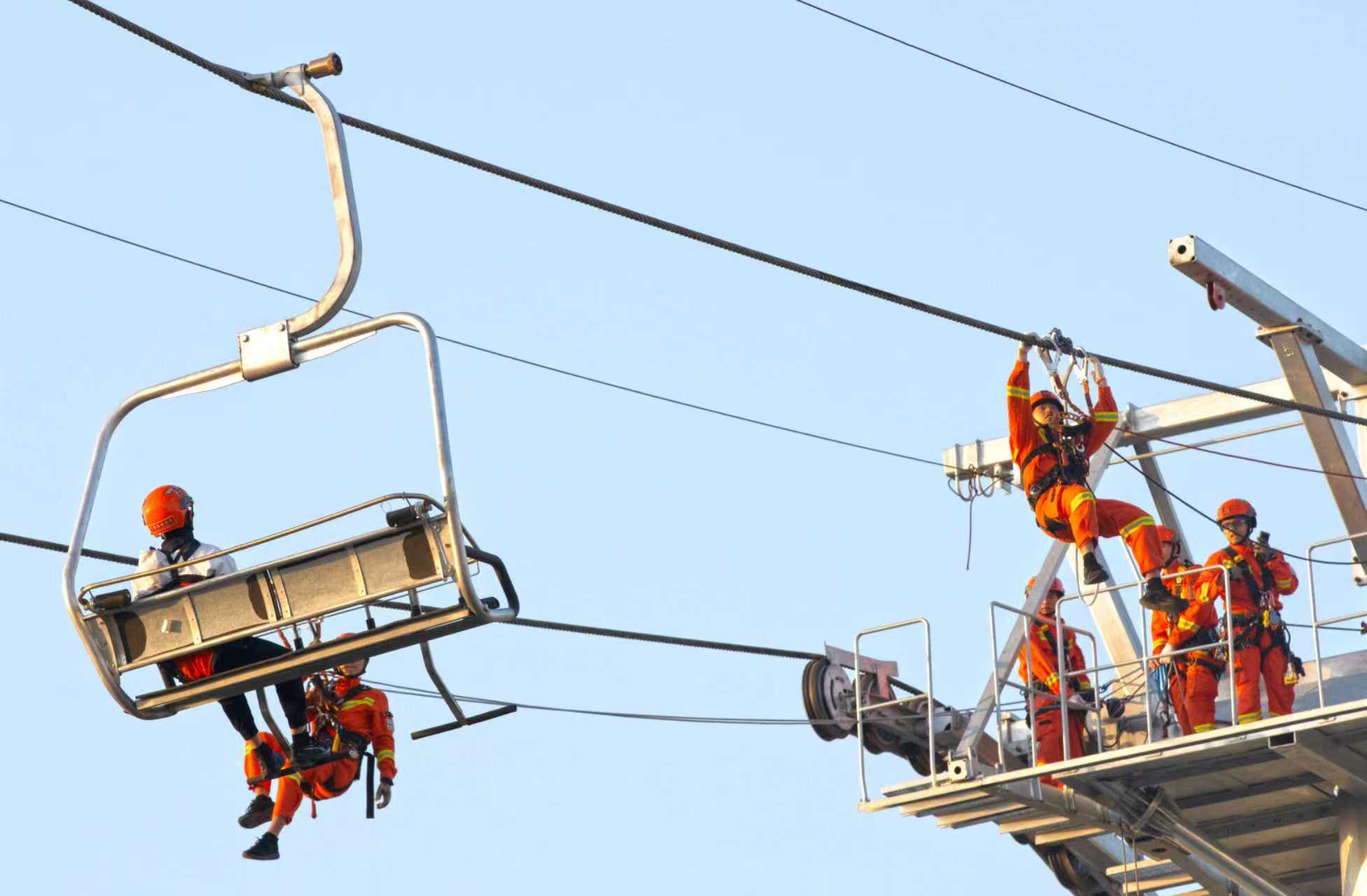 “绳桥搭建完毕,先锋立即向被困人员靠近……”指挥员指令刚落,救援先锋迅速行动,在高空中利用绳索系统顺利到达被困游客吊椅位置后,安抚稳定被困游客情绪,示意辅救固定移动保护器,协助被困游客穿好救援吊带,随后打开围栏,扣动救援下降器(ID)的操作柄,利用绳索平稳释放被困游客至地面。此时,辅救开始收绳,救援先锋为轿厢内第二名被困游客穿戴救援三角吊带,而后缓慢释放ID下降器,使第二名被困游客下降到地面,救援结束。