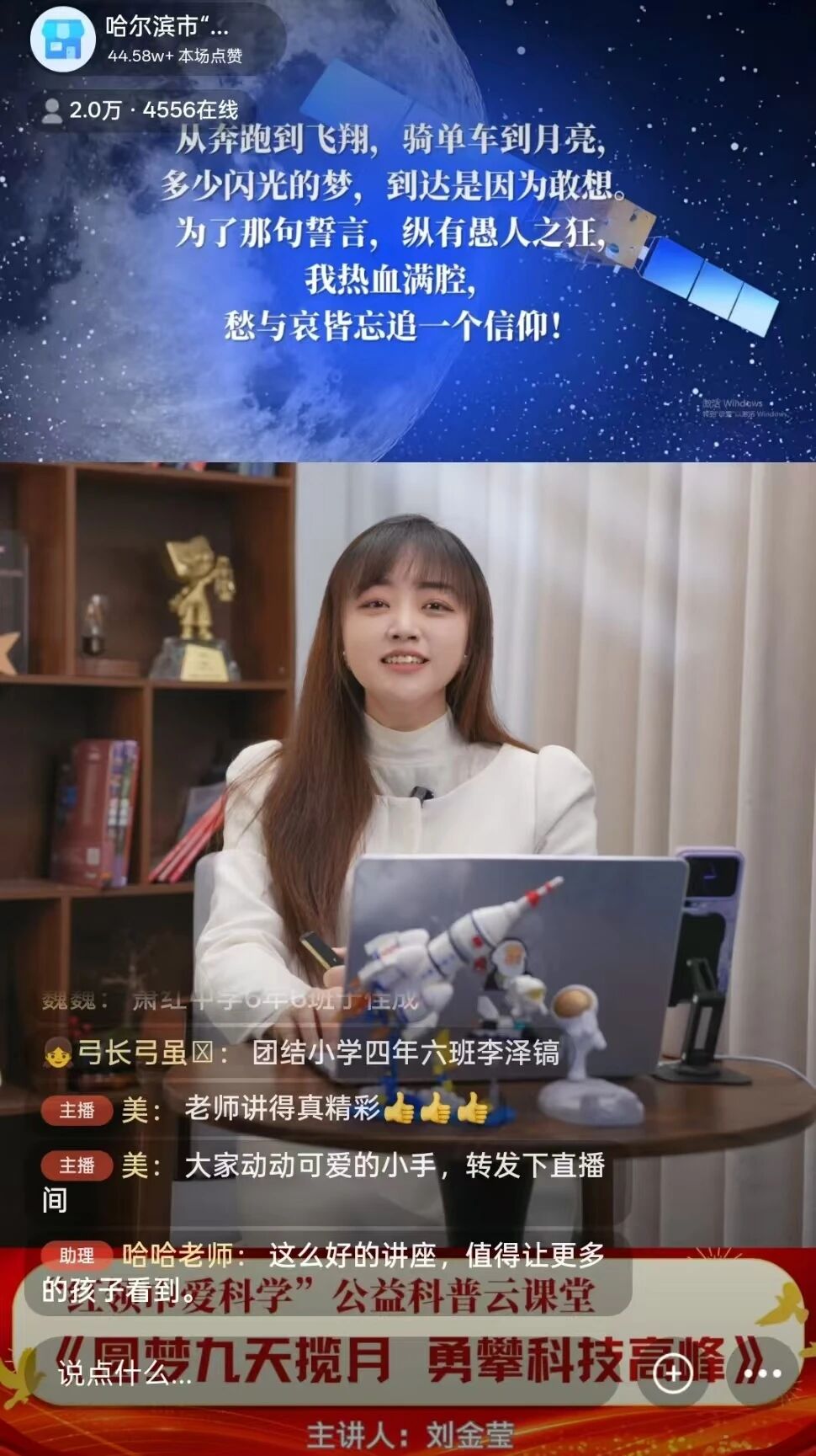 12月28日上午,公益科普云课堂首期正式开课。哈尔滨工业大学刘金莹老师担任主讲,以《奔月之路:圆梦九天揽月 勇攀科技高峰》为主题,为全市广大青少年及科技爱好者带来了一场生动的探月科普盛宴。直播间访客数达2.2万余人次,总浏览量突破9.4万次,点赞超过55万次。