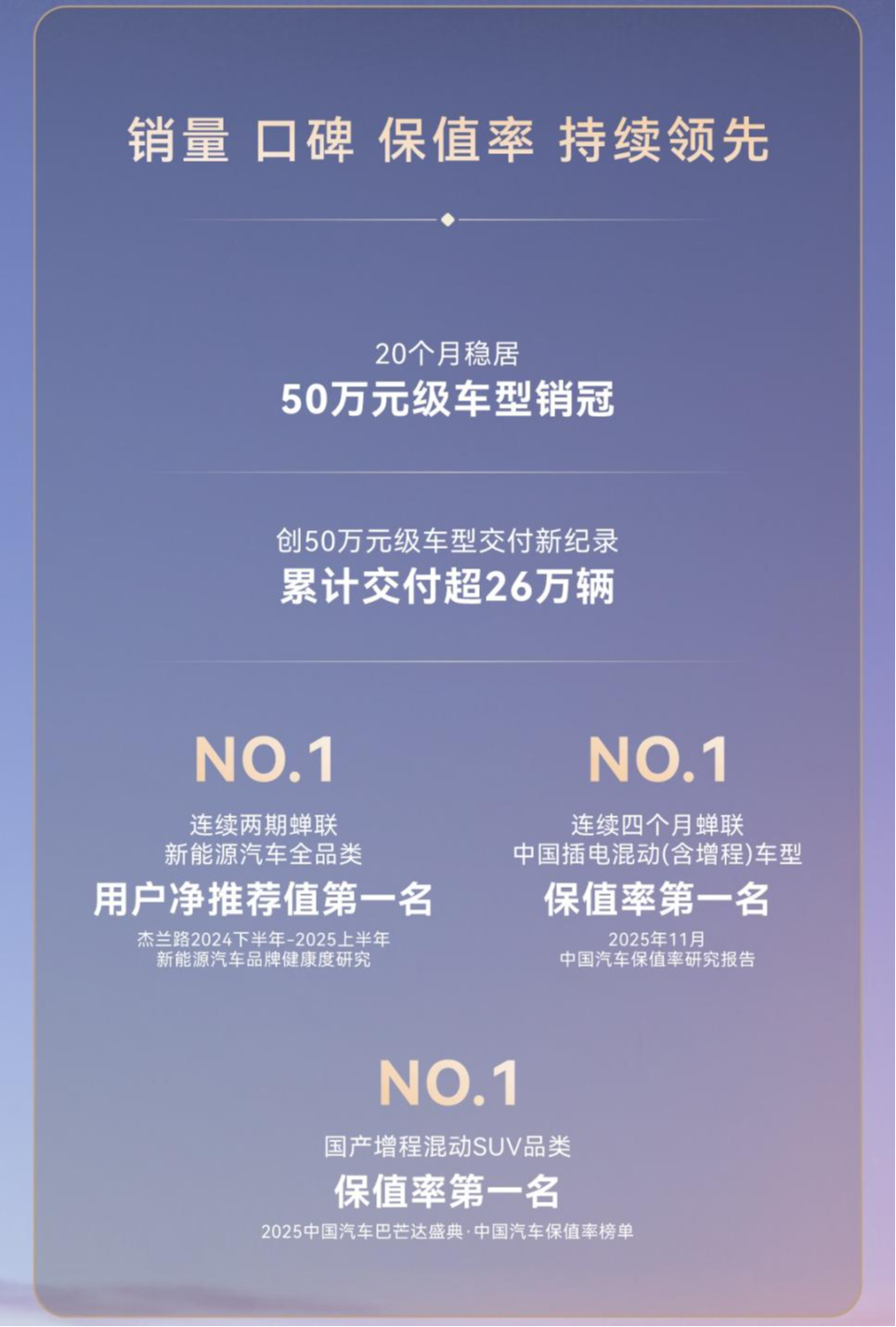 除了销量与交付量持续攀升,问界M9更以净推荐值、保值率双第一的成绩,稳坐豪华汽车市场标杆席位。在中国汽车流通协会发布的《2025年11月中国汽车保值率研究报告》中,问界M9已连续四个月蝉联中国插电混动(含增程)车型保值率第一,并在2025中国汽车巴芒达盛典“中国汽车保值率榜单”中位列国产增程混动SUV第一,展现50万级豪华车价值新高度。在杰兰路2024下半年-2025上半年新能源汽车品牌健康度研究中,问界M9连续两期获得新能源全车型用户净推荐值第一。此外,在中国质量协会发布的2025年中国新能源汽车行业用户满意度指数评测结果中,问界M9荣获第一名,并在J.D. Power 魅力指数榜单中位列豪华插电混动SUV第一……这一系列殊荣,共同印证了这款现象级产品在新能源豪华车市场的标杆实力。
