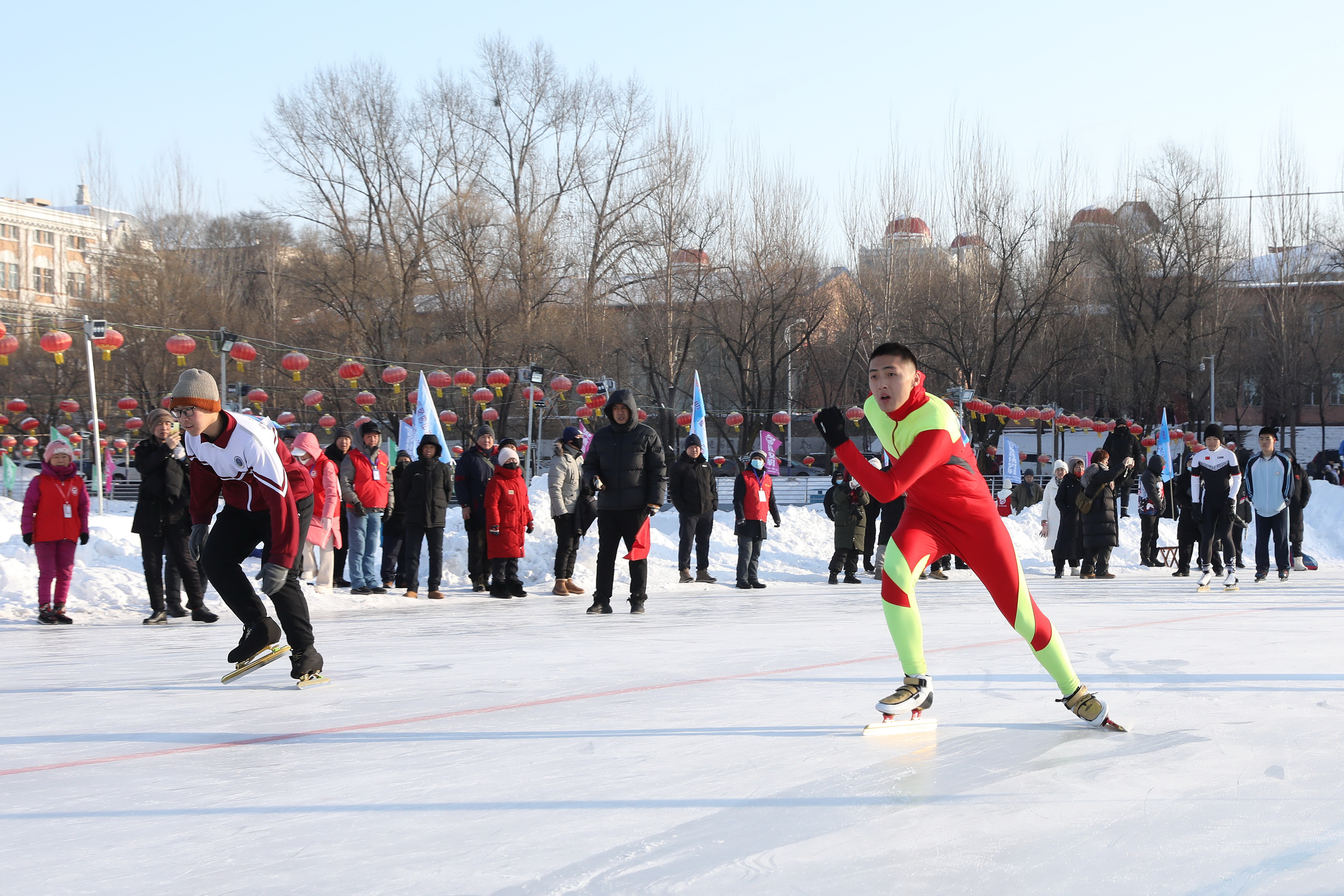 竞技赛场上同样精彩纷呈。速度滑冰项目中,运动员们技术娴熟、驰骋如风,尽情享受冰上运动带来的速度与激情。“老师一直鼓励我,我每天都坚持练习,我特别喜欢站在冰面滑行的感觉,就像飞起来一样。”鹤岗市实验小学学生王裕勋分享道。鹤岗市第一中学学生刘桓渤表示:“在滑冰的比赛项目中,我也感觉到竞技体育的魅力和责任感。作为高中生,我们愿意成为冰雪运动火种,带领更多人参与,为家乡冰雪文化发展贡献青春力量。”