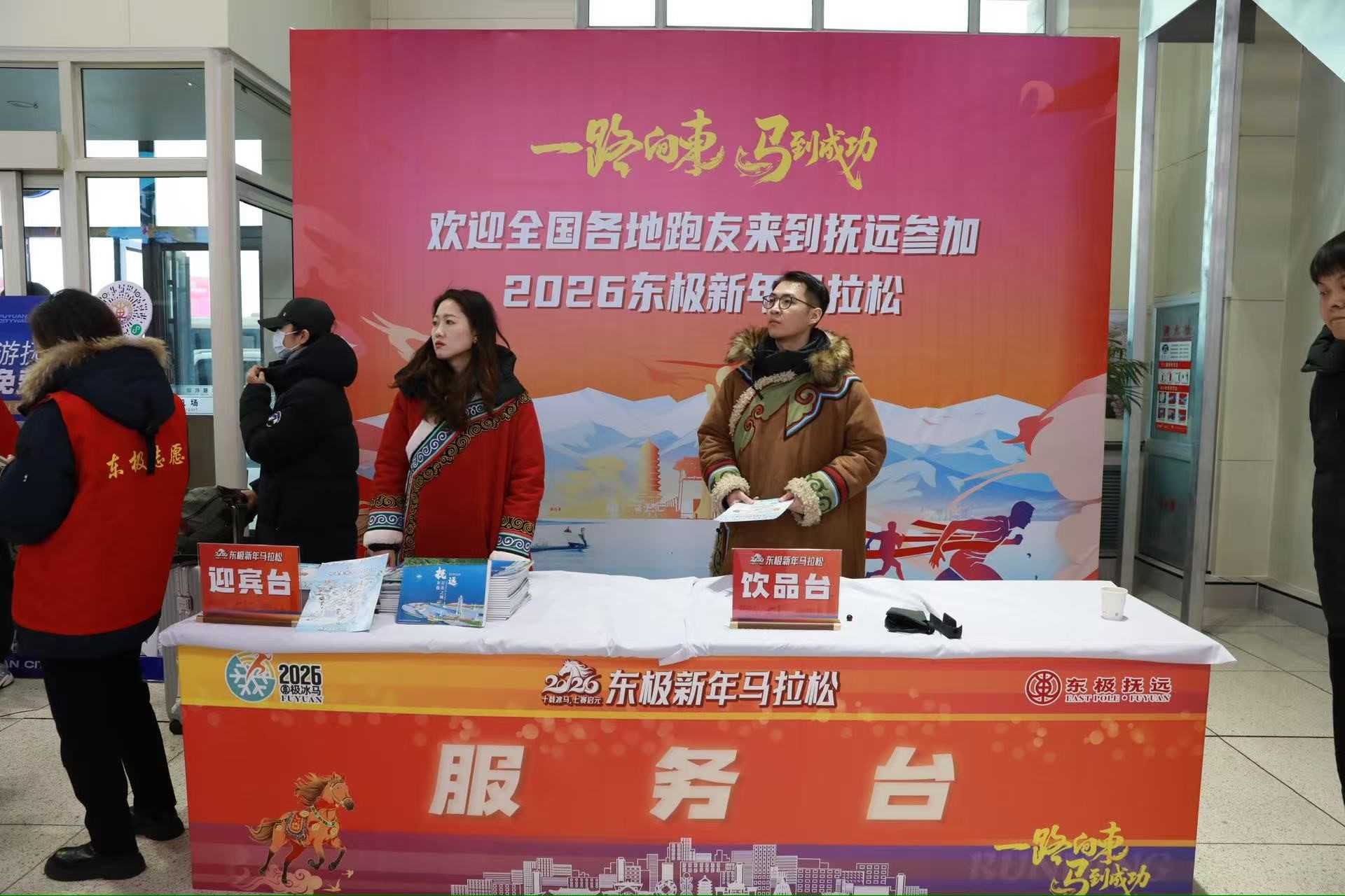 双站精准护航,服务暖人心。东极机场、火车站同步设立东极新年马拉松专属服务台,每点位专人值守、精准发力,2名工作人员全天候在岗,以专业高效的宣传引导、细致周全的咨询解答,为跑者递上参赛活动指南,将赛事信息、东极风情尽数传递,让贴心服务贯穿行程始终,尽显东极待客之道的周全与暖心。