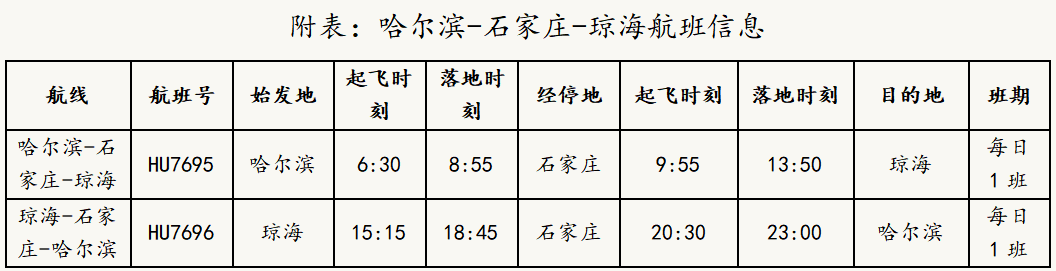 该航线每日执行一班往返高频次运营,极大便利三地间的公商务往来与旅游出行,航班时刻充分贴合旅客出行节奏:去程航班HU7695于每日06:30从哈尔滨太平国际机场起飞,08:55抵达石家庄正定国际机场,之后于09:55再次起飞,13:50抵达琼海博鳌国际机场;返程航班HU7696于15:15从琼海起飞,18:45抵达石家庄,随后于20:30再次起飞,23:00抵达哈尔滨。全程衔接顺畅,有效节约旅客出行时间。具体航班信息以购票时实际查询为准,旅客可通过海南航空官网、APP或各大售票平台查询及购买。