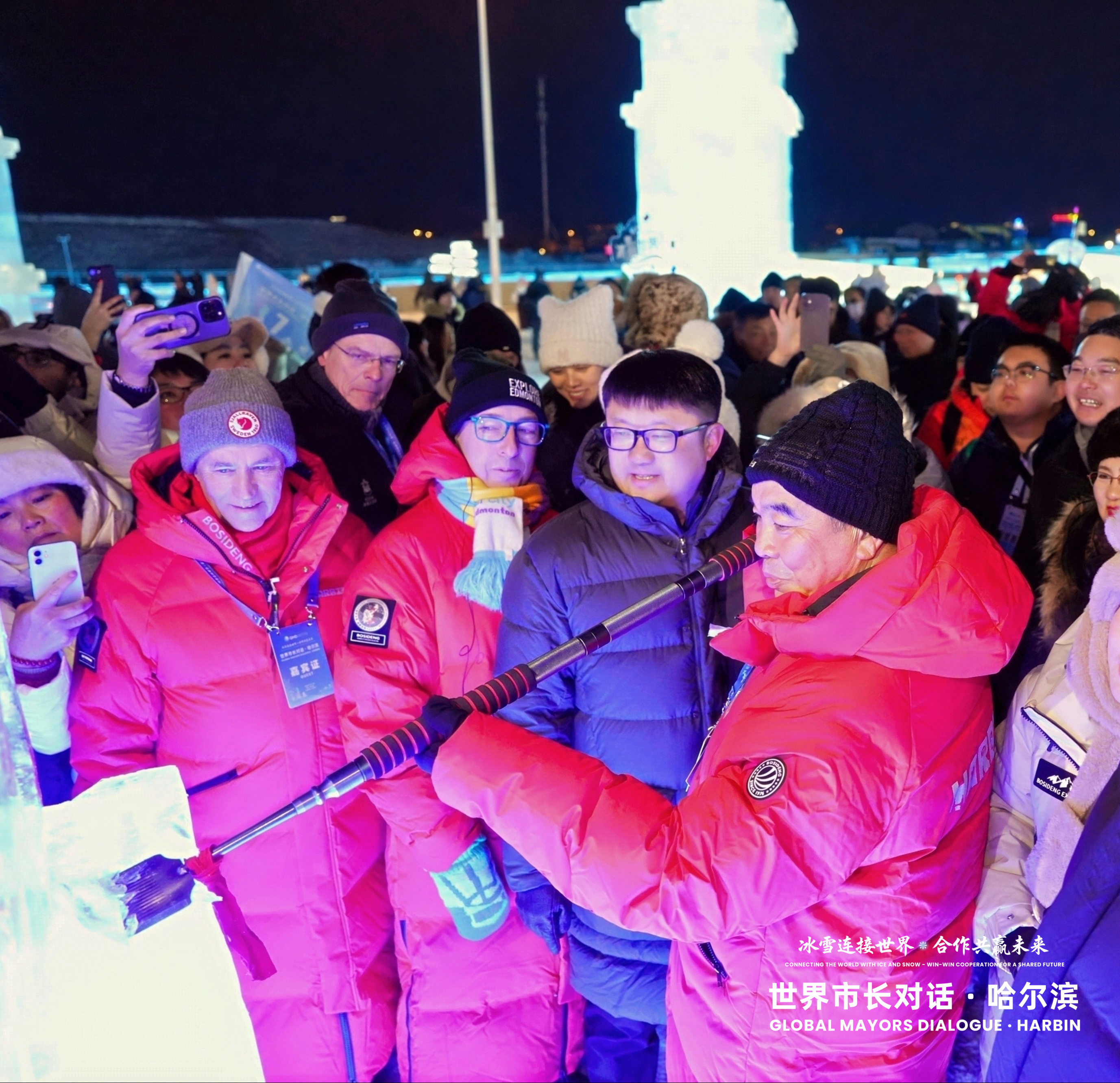 启幕仪式后,多国市长在哈尔滨冰雪大世界园区内体验冰雕技艺并参加以“冷资源变身热经济:冰雪绘就城市发展新图景”为主题的沙龙活动。