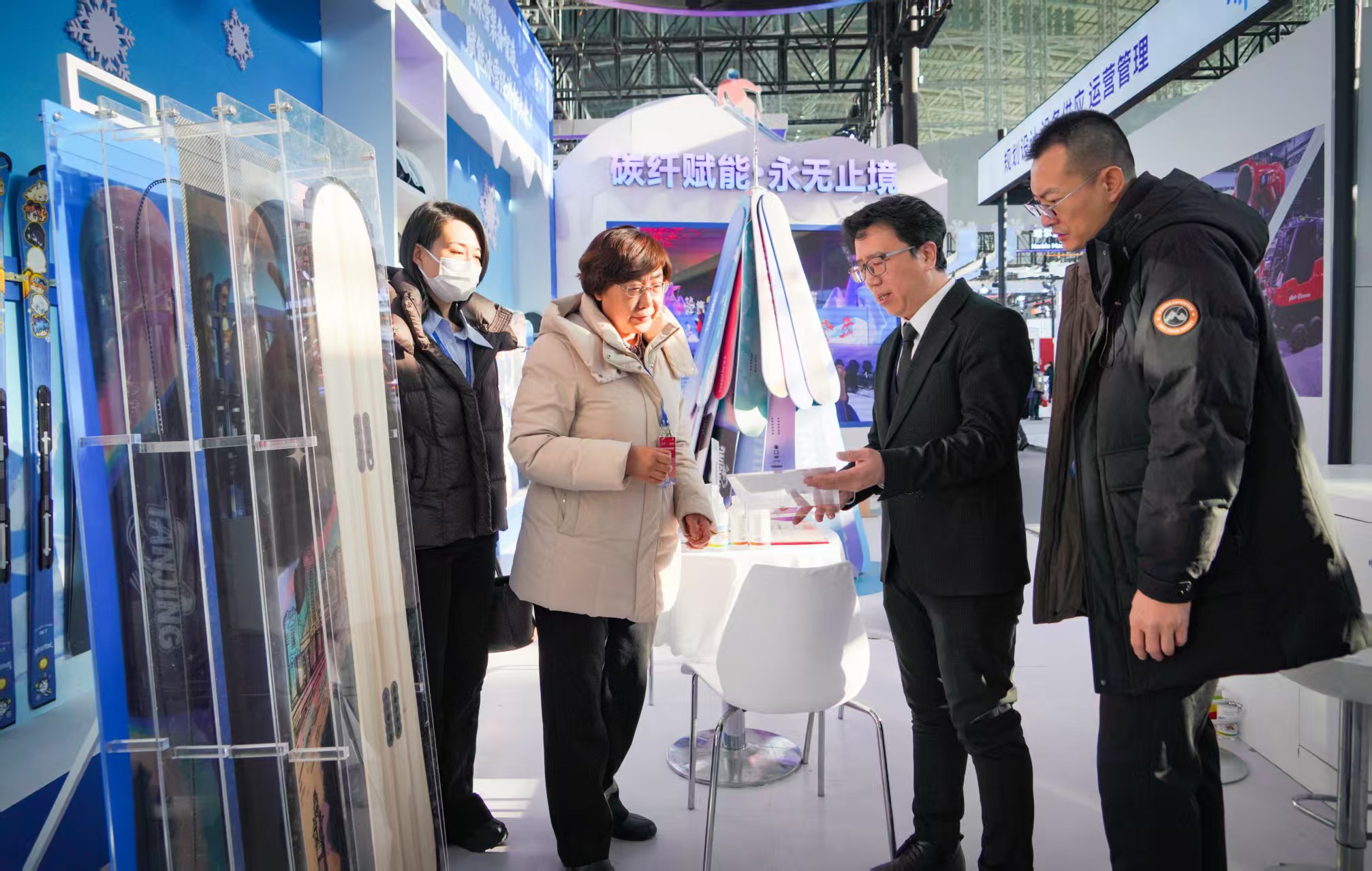 文创吸睛,科技更是硬核。在碳纤维热塑性复合材料预浸料及配套生产线模型展示区,技术人员正为观众演示快速成型原理。“这种材料密度只有钢的五分之一,抗拉强度却能达到钛合金的3倍,而且完全可回收。”工作人员一边操作模型,一边讲解新材料的优势,“用它制作的滑雪板,不仅滑行时更灵活,耐用性也大幅提升,还符合绿色发展理念。”