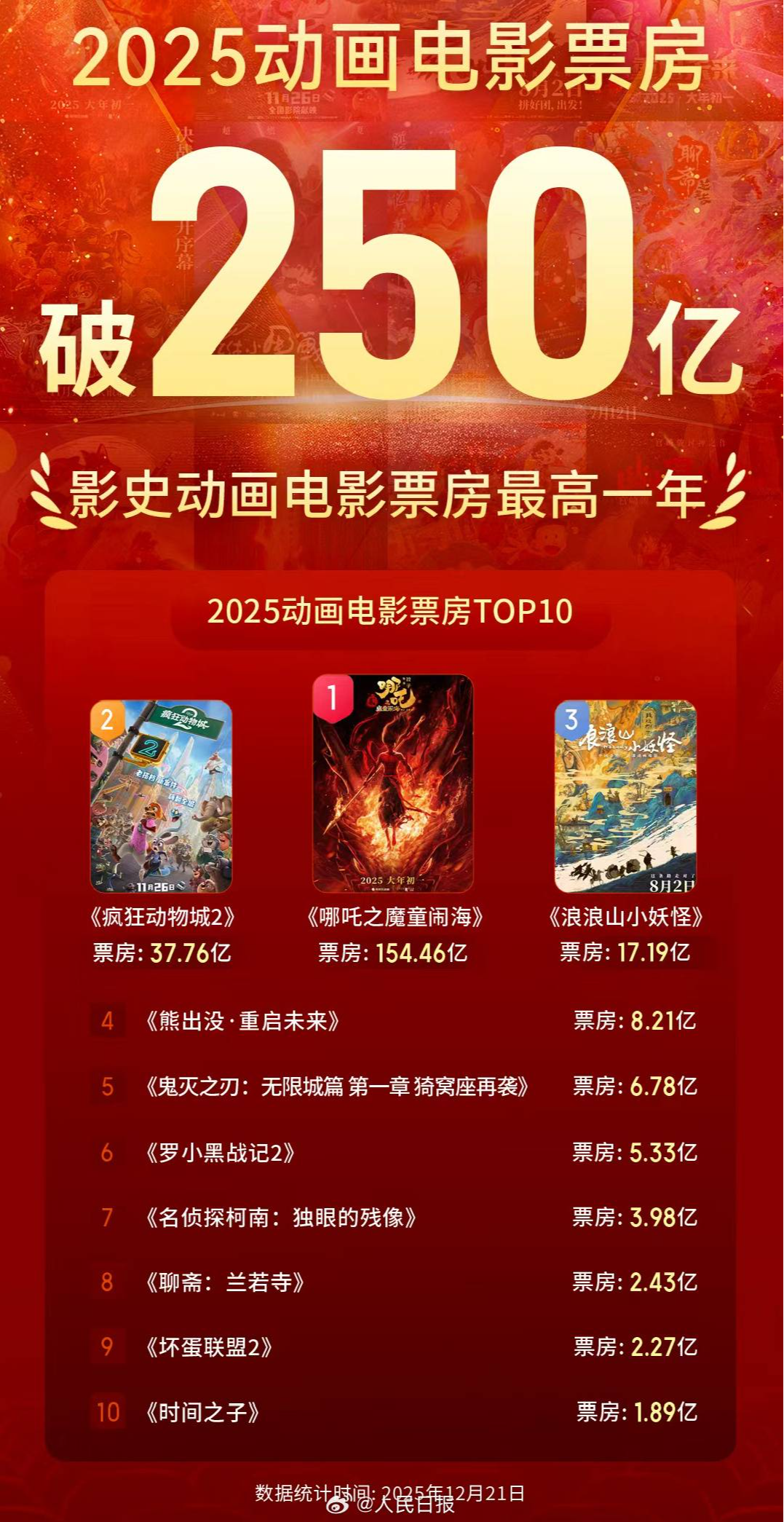2025年,踩着风火轮的“哪吒”汇聚世界目光:《哪吒2》以159.49亿元的全球票房成为全球影史动画电影票房冠军,同时也成为影史上第一部挺进全球电影票房前十的亚洲电影,位列全球影史票房第五位。