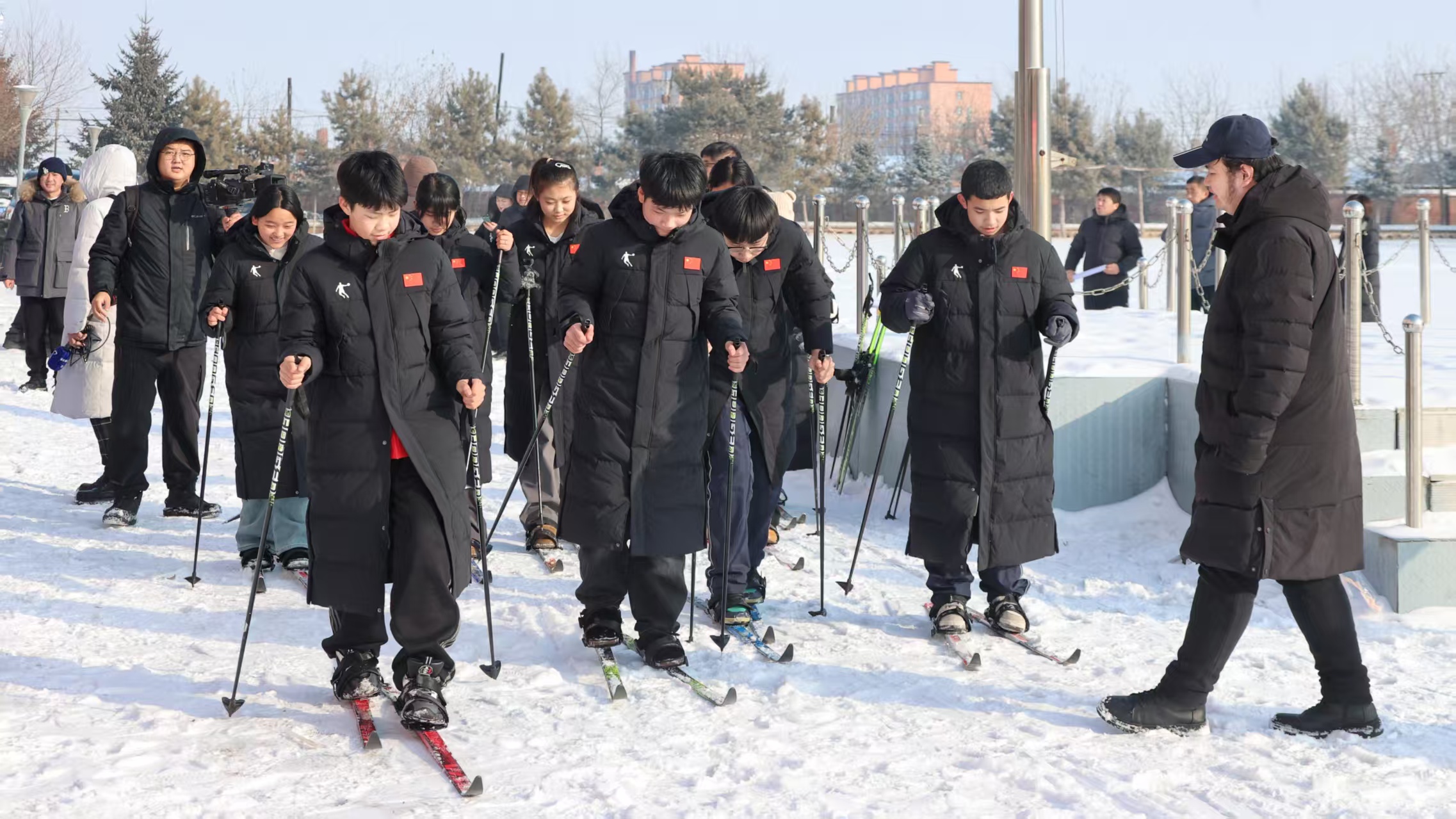 穿上保暖又舒适的羽绒服后,同学们来到操场进行了越野滑雪训练。他们难掩兴奋,纷纷表示要带着这份关爱在越野滑雪中刻苦训练。