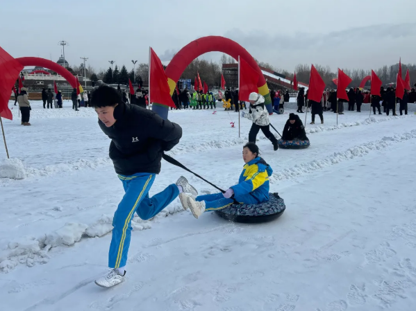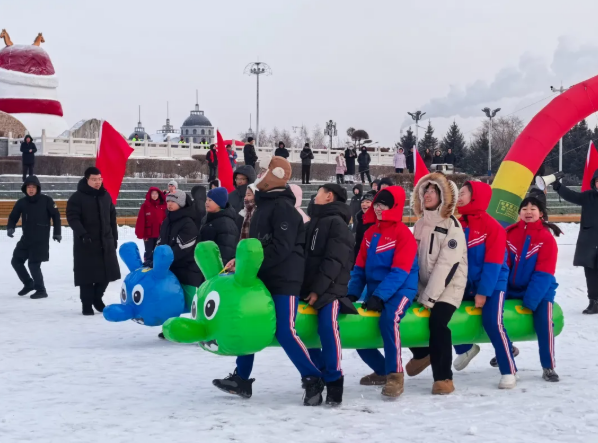 雪地毛毛虫比赛中,队员们跨坐在毛毛虫道具上,喊着“一二、一二”的整齐口号,双脚同步蹬着雪地向前冲。有的队伍节奏一致,毛毛虫在雪地上“蹦跳”着快速前进;有的队伍稍显慌乱,毛毛虫左右摇晃,队员们手忙脚乱调整步伐,惹得场边观众哈哈大笑。雪地上的“彩色毛毛虫”你追我赶,是诙谐与默契的碰撞。