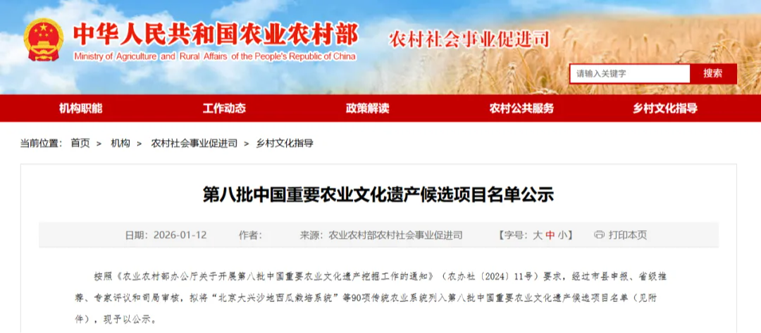 1月12日,农业农村部网站公示第八批中国重要农业文化遗产候选项目名单。经过市县申报、省级推荐、专家评议和司局审核,拟将90项传统农业系统列入第八批中国重要农业文化遗产候选项目名单。其中,黑龙江2项传统农业系统入选。