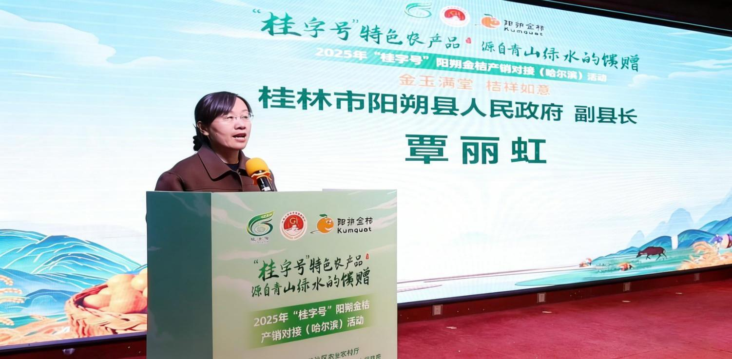 阳朔县人民政府副县长覃丽虹在活动致辞中表示,目前阳朔拥有阳朔金桔、沙田柚、蜂蜜等多个国家地理标志认证产品,其中金桔产业优势尤为突出,以产品品质最优,综合效益最好,稳居全国金桔主产县之首,果品远销马来西亚、俄罗斯、加拿大等海外市场。阳朔与哈尔滨,虽一南一北,气候迥异、物产各具特色,但互补性极强,合作空间广阔。此次产销对接活动,希望能与各位企业家朋友深入交流、精准对接,达成更多务实合作。