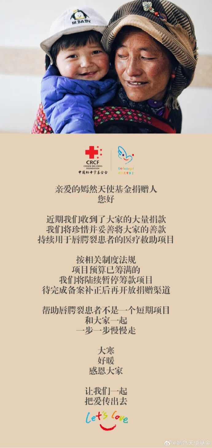 嫣然天使基金发声:暂停筹款