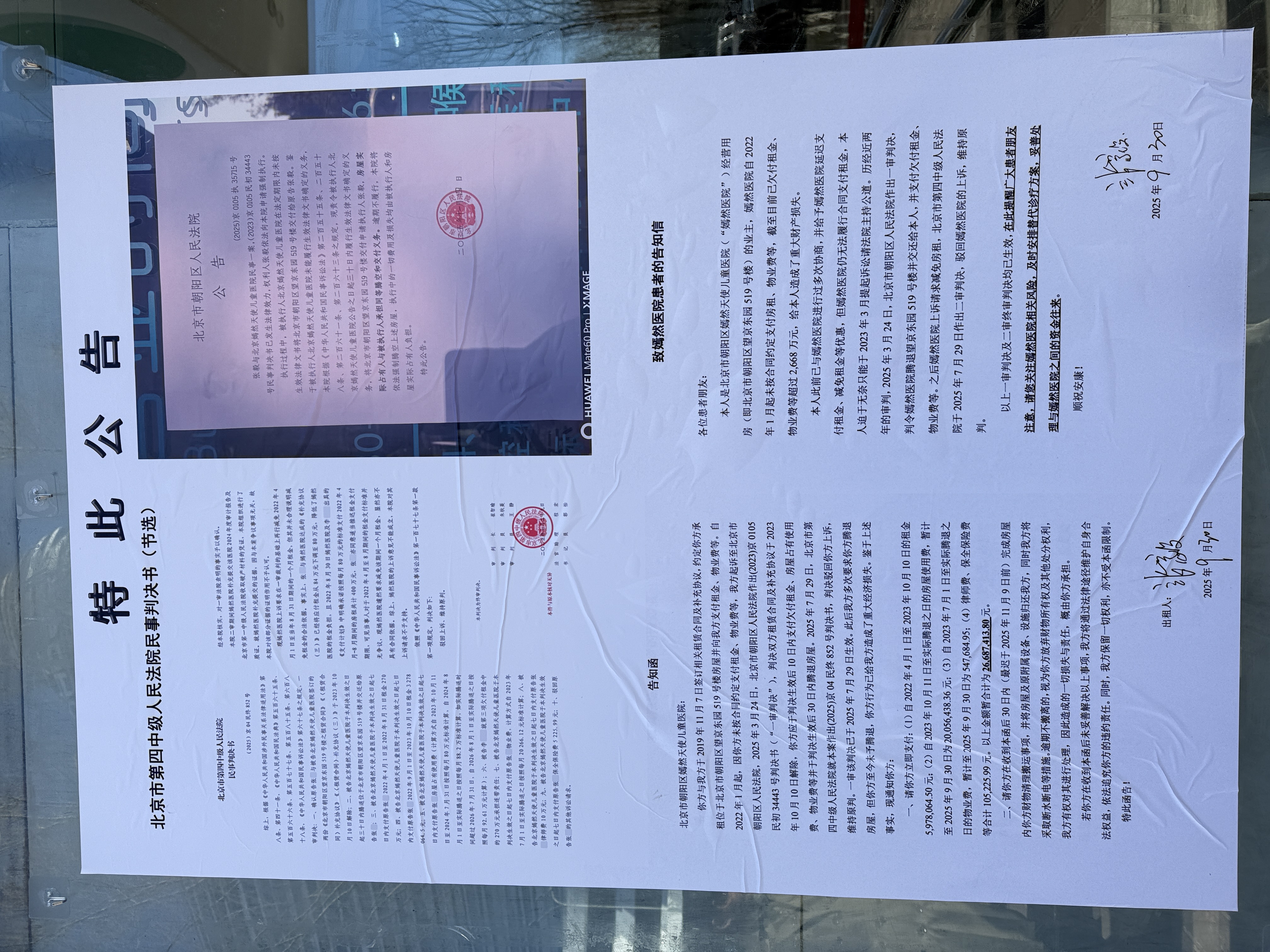 1月20日上午,维度新闻记者来到嫣然天使儿童医院,记者看到医院外墙上的字体已经被拆除,但仍旧可以看到痕迹。在医院玻璃墙上,粘贴着一份关于“北京市第四中院对租房纠纷的判决书节选和房东要求履约”的公告,公告上写有“嫣然医院自2022年1月起未按合同约定支付房租、物业费等,截至2025年9月已欠超过两千多万元。”