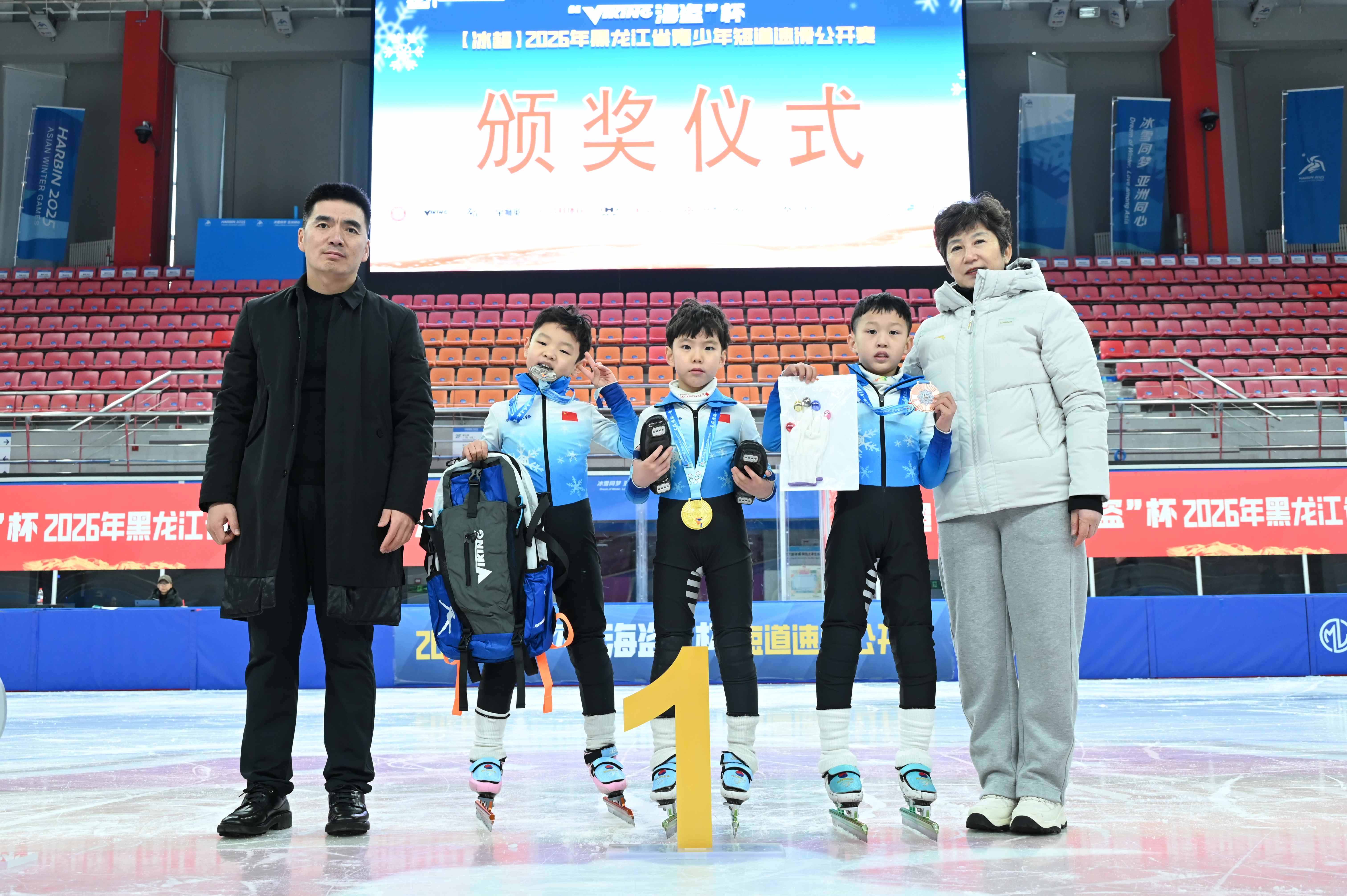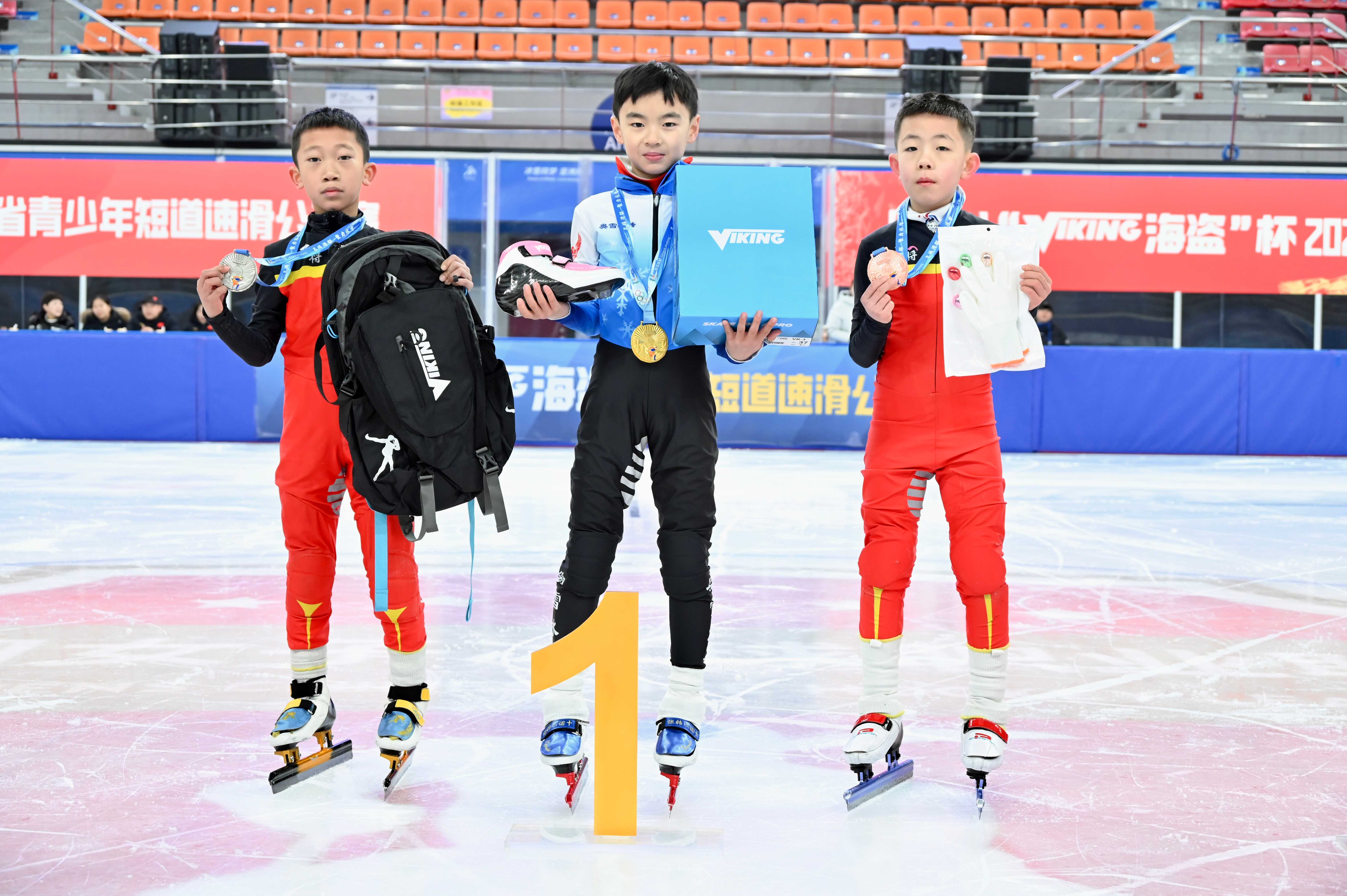 中场休息时,动感音乐为紧张的赛事注入轻松氛围。颁奖环节,获奖小将们站上领奖台,由荷兰VIKING海盗冰刀提供的优质奖品与特制奖牌的荣耀加持,既是对他们长期训练的最佳回馈,也印证了赛事筹备的专业价值。此次赛事的圆满落幕,不仅为青少年短道速滑爱好者提供了交流展示的平台,更以专业筹备与精彩竞技,进一步推动了青少年冰雪运动在本地的普及与发展。