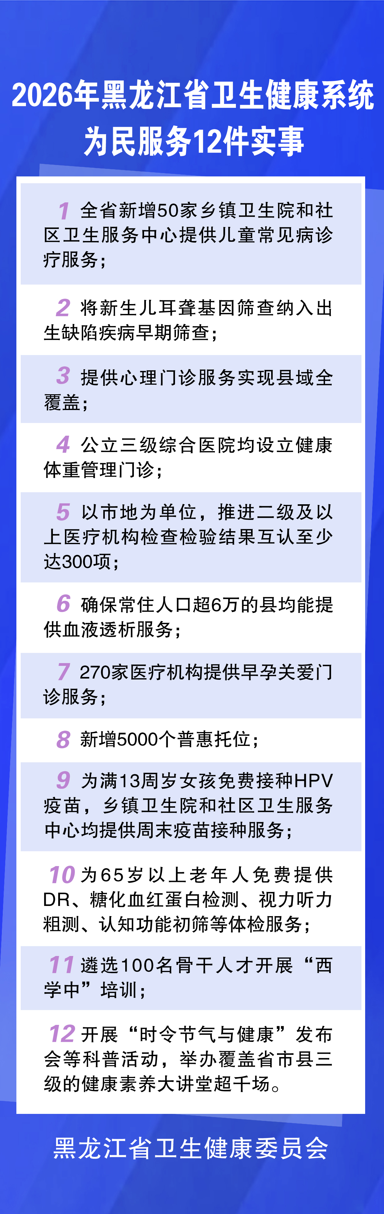 黑龙江网讯(记者 韩俏)近日,全省卫生健康工作会议在哈尔滨召开,系统总结2025年和“十四五”卫生健康工作成效,全面部署2026年重点工作。会上,黑龙江省卫生健康委员会确定2026年全省卫生健康系统十大行动、12件为民服务实事。