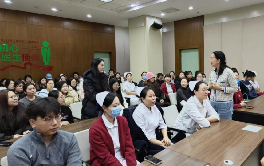 宣讲结束后,董梅副院长与青年护士们展开亲切座谈。她结合自身经历,勉励新护士:既要夯实专业基础,提升急诊急救能力,更要涵养同理心,以温度守护生命。面对新入职护士提出的困惑,她耐心倾听、逐一答疑,以专业的指导和温暖的鼓励为青年护士们排忧解难,现场氛围温馨融洽。