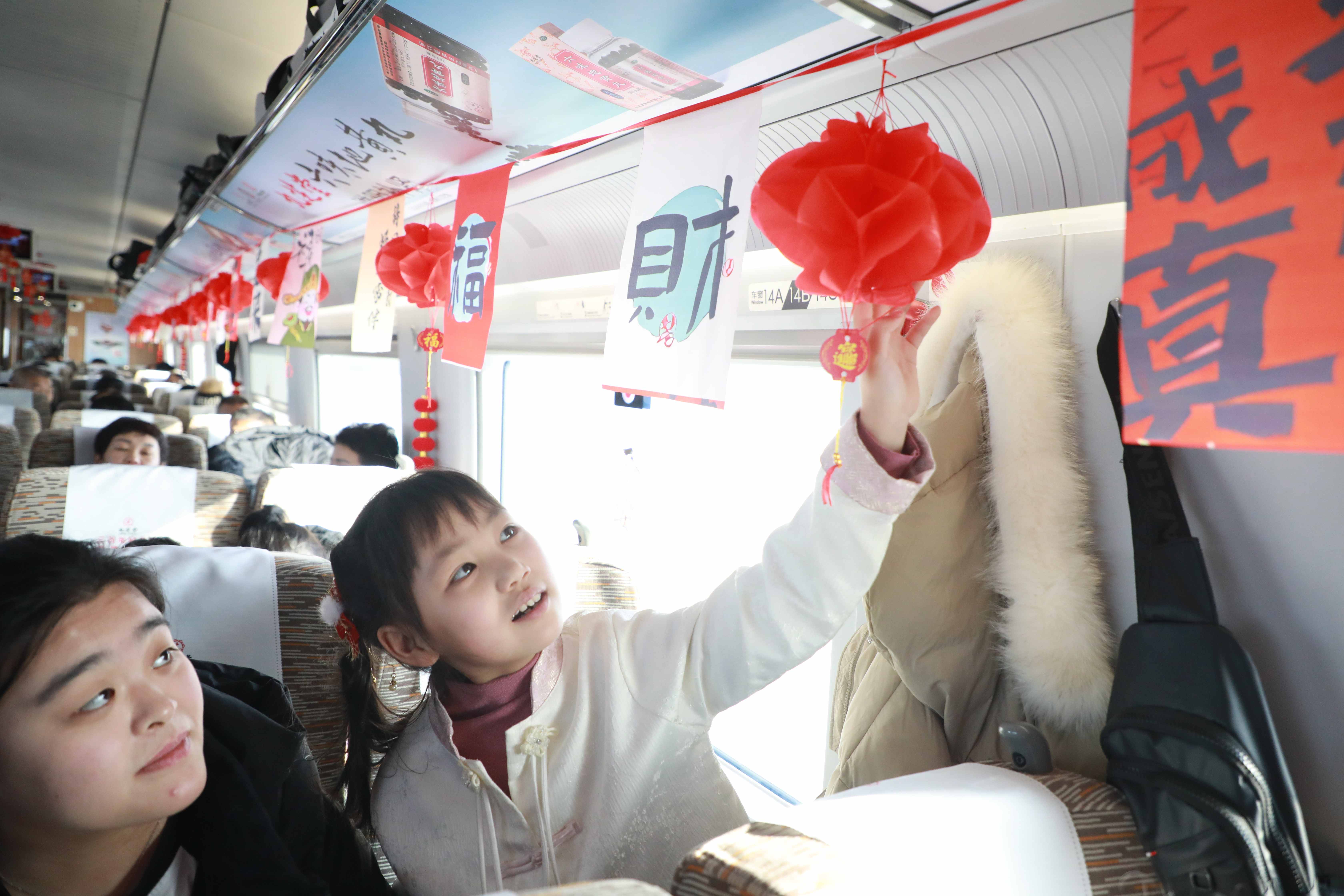 当日,G3510次列车车厢内装饰着红色窗花与福字,节日氛围浓厚。列车工作人员向旅客送上热腾腾的腊八粥并致以节日问候,小旅客们还收到了糖葫芦、冻梨、发卡等特色糖果礼物。贴窗花互动环节中,旅客们亲手粘贴寓意吉祥的窗花,窗外飞驰的北国雪景与窗内红火温馨的场景相映成趣。工作人员同步讲解腊八节的来历与习俗,让旅途成为生动的文化体验。
