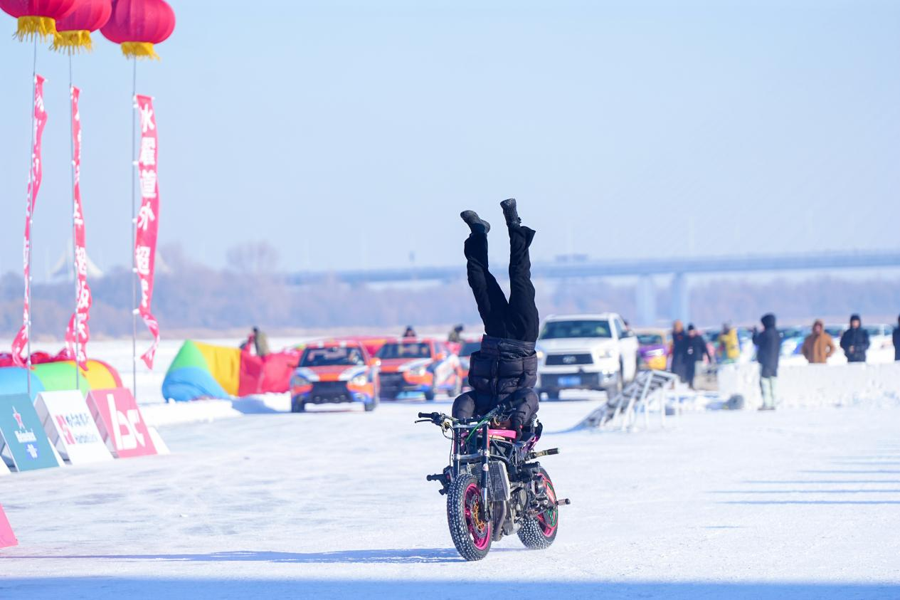 启动仪式落幕,一场燃动冰雪的赛事表演随即登场,瞬间点燃全场热情。轰鸣的引擎声划破天际,摩托车特技车手们在冰雪赛道上风驰电掣,以腾空飞跃、交叉穿梭的高难度动作,展现着速度与技巧的完美融合。汽车单边表演更是将惊险与刺激拉满,单侧车轮稳稳行驶于冰雪之上,车身倾斜的极限姿态,引得现场观众阵阵惊呼。而压轴登场的冰雪飘移,让赛车在冰面划出优美弧线,轮胎与冰雪摩擦的嘶鸣、车尾扬起的雪雾,将速度与激情的魅力诠释得淋漓尽致。
