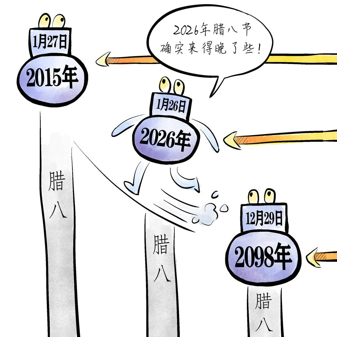 腊八通常在每年公历12月下旬至1月下旬之间变动。天文年历显示,就21世纪这100年而言,最早腊八出现在公历中的12月29日(如2098年),最晚腊八出现在公历中的1月27日(如2015年),两者相差了将近1个月。这么一看,今年的腊八确实来得有些晚。