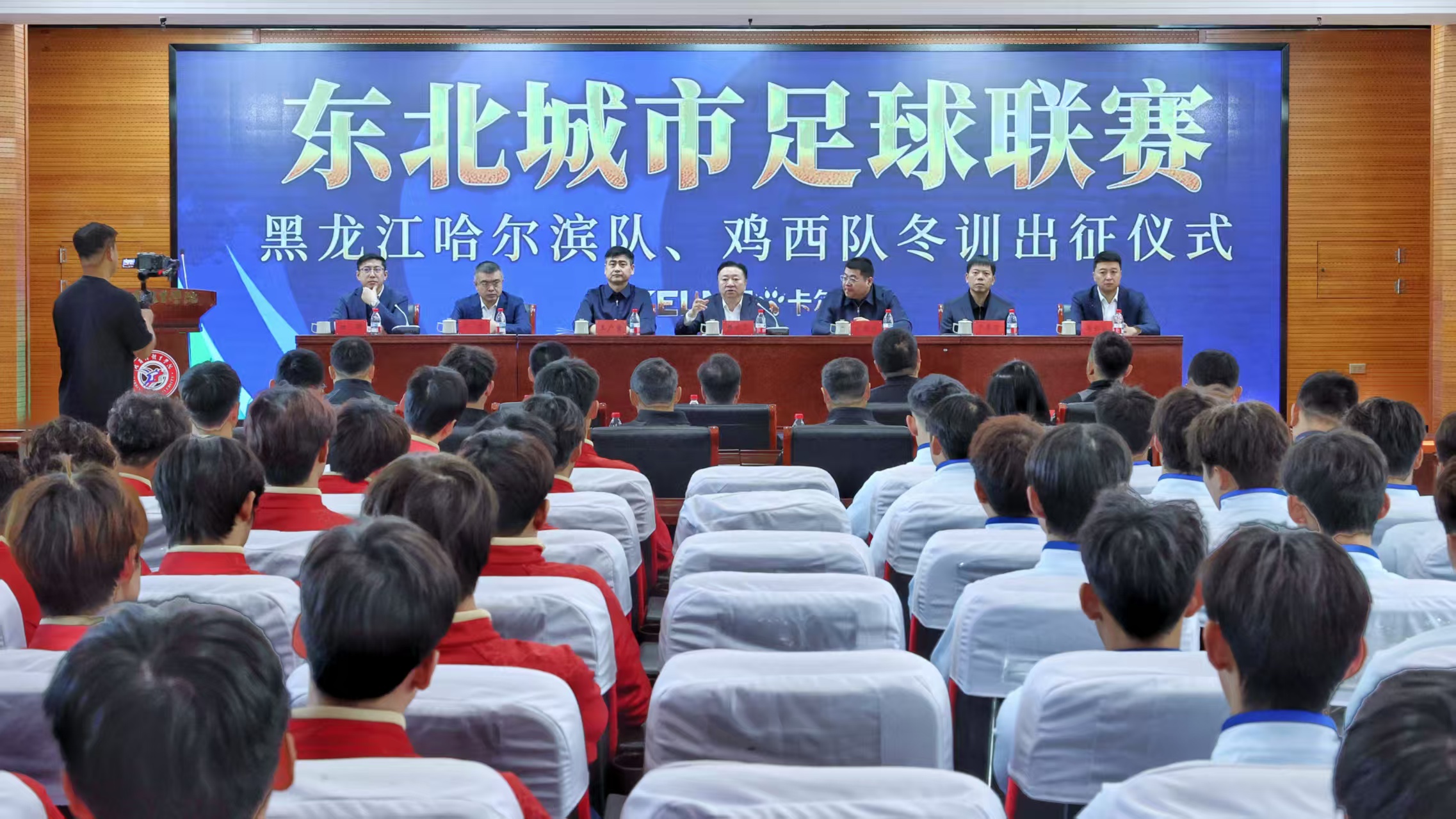 黑龙江网讯(实习记者 王芊力 记者 贾博)1月28日,东北城市足球联赛黑龙江哈尔滨队、鸡西队冬训出征仪式在哈尔滨体育学院举行。