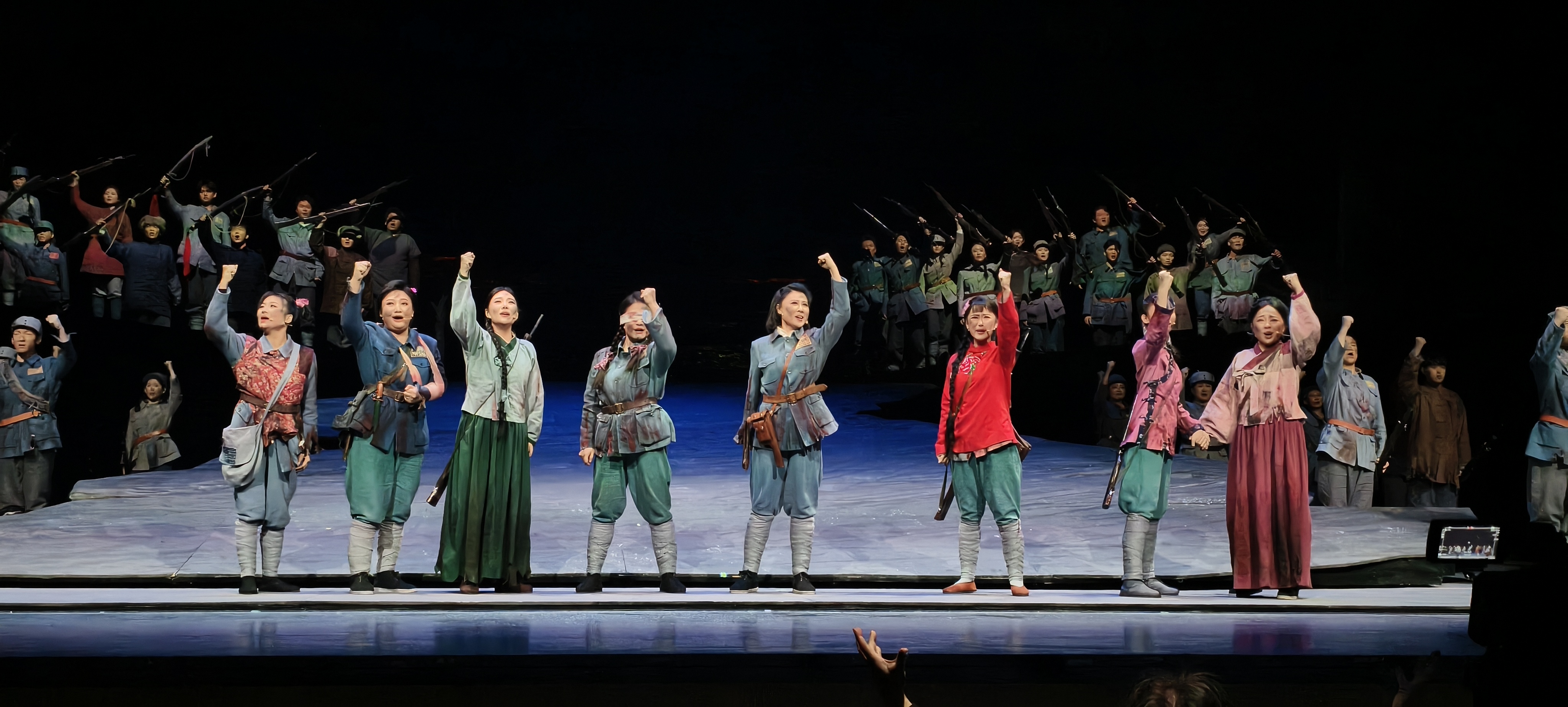 作曲家巧妙融合东北民间音乐元素与现代作曲技法,旋律时而婉转深情,时而激越悲壮。一曲《头场雪》,一段《血脉代代传》,唱出了血肉丰满的抗联群像。当八位女战士挽臂高歌、毅然赴江时,音乐达到高潮,极具感染力的和声让英雄主义的崇高与牺牲的壮烈直击人心,完成了从历史叙事到精神升华的艺术跨越。