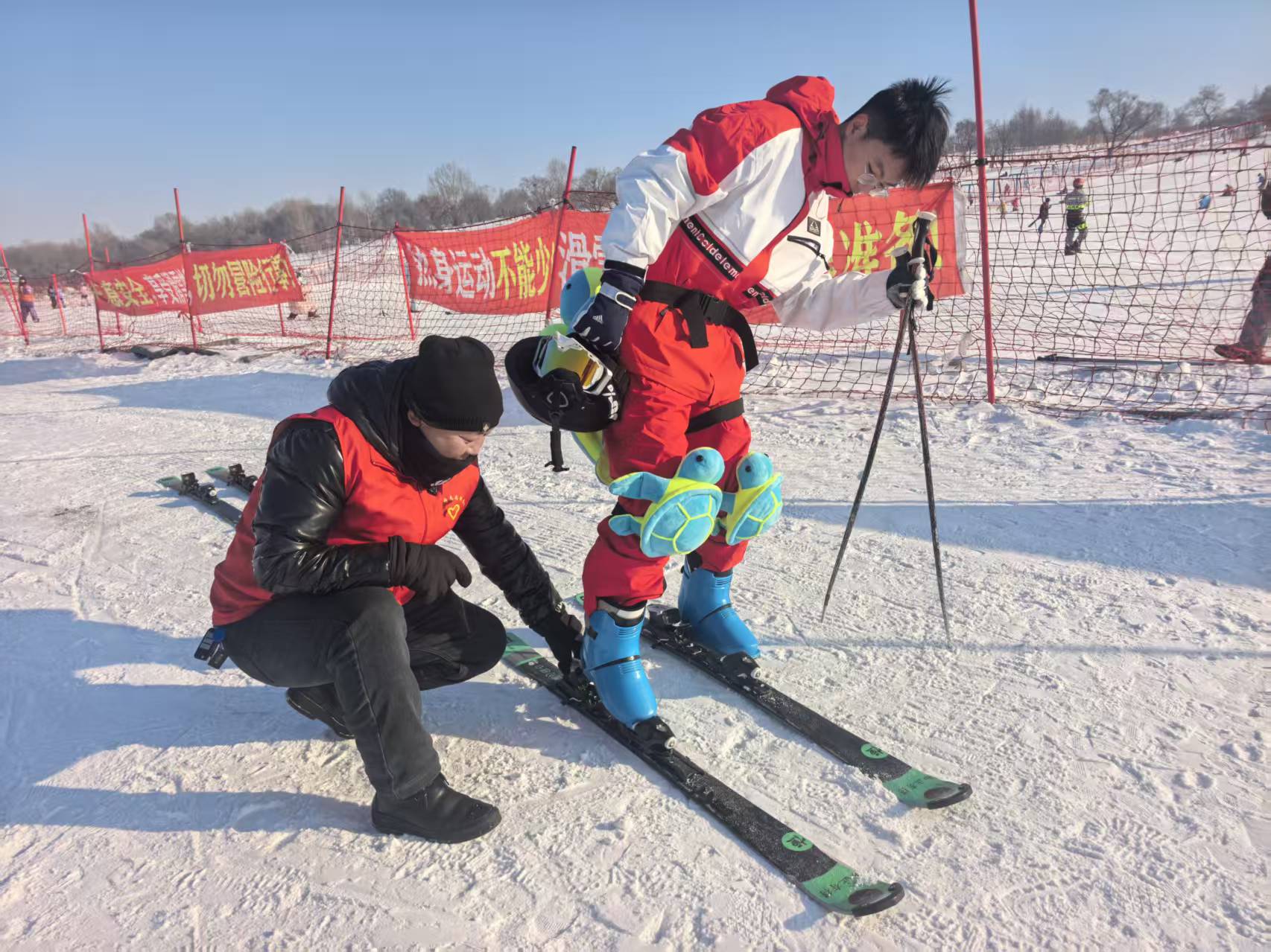 在雪场,冯玉波一站就是七八个小时,寒风中他身影忙碌而坚定:耐心协助游客穿戴雪板、精准选递合手的雪仗,弯腰整理装备时的细致,叮嘱安全事项时的恳切,都让初来乍到的滑雪者倍感安心。他不仅主动维护雪场秩序,及时疏导人流、提醒大家规避风险,更用细心与责任守护着每一位游客的出行安全。
