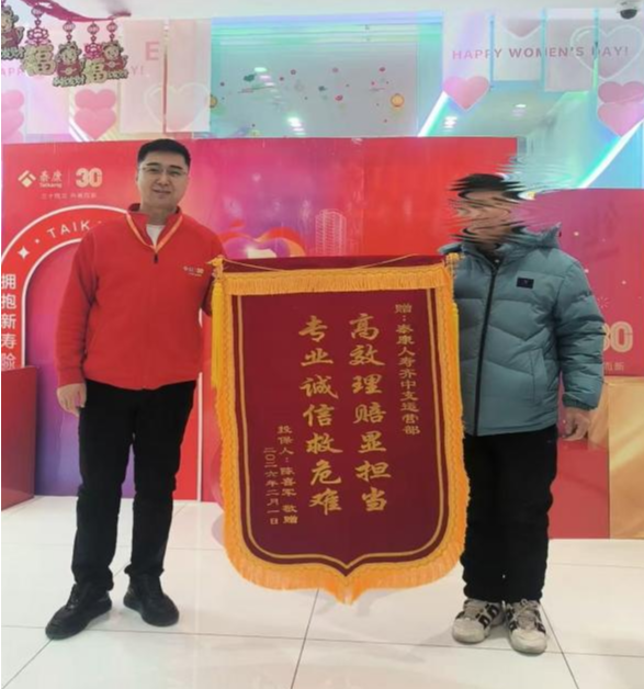 黑龙江网讯(王昕 记者 王忠岩)近日,齐齐哈尔市陈先生专程前往泰康人寿齐齐哈尔中支,将印有“专业高效解民忧 一诺千金守诚信”的鲜红锦旗送到工作人员手中,以此致谢该公司在他遭遇疾病时的及时保障与暖心服务。