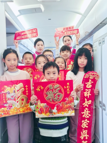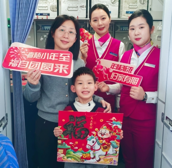 “知识竞答”环节,旅客们踊跃参与。从南北小年日期之别到祭灶、扫尘的古老习俗,在趣味问答中深化了对传统文化的理解。一位带着孩子的家长感慨:“在飞机上过小年,对于我和孩子都是难忘的体验。”“乡音送福”环节,旅客们用天南地北的方言互道新春祝福,分享家乡独特的年节故事,客舱瞬间化作一片汇聚四方温情的暖融空间。“年货大集”环节,乘务组为旅客精心准备了“空中年货礼”。乘务员们手持洋溢着墨香与年味的春联、寓意吉祥的年画、印制精美的传统挂历等节日礼品,逐一送至旅客手中。一份份满载心意的“年货”,传递着“新年纳余庆,嘉节号长春”的美好祝愿。“祈福迎新年”环节将气氛推向高潮。旅客们在精致的祈福卡上书写对未来的展望与期盼,并将卡片悬挂于客舱特设的祈福角。一笔一划,皆是心愿;方寸之间,承载美好。最后,旅客与乘务组合影,将云端年俗之旅定格。