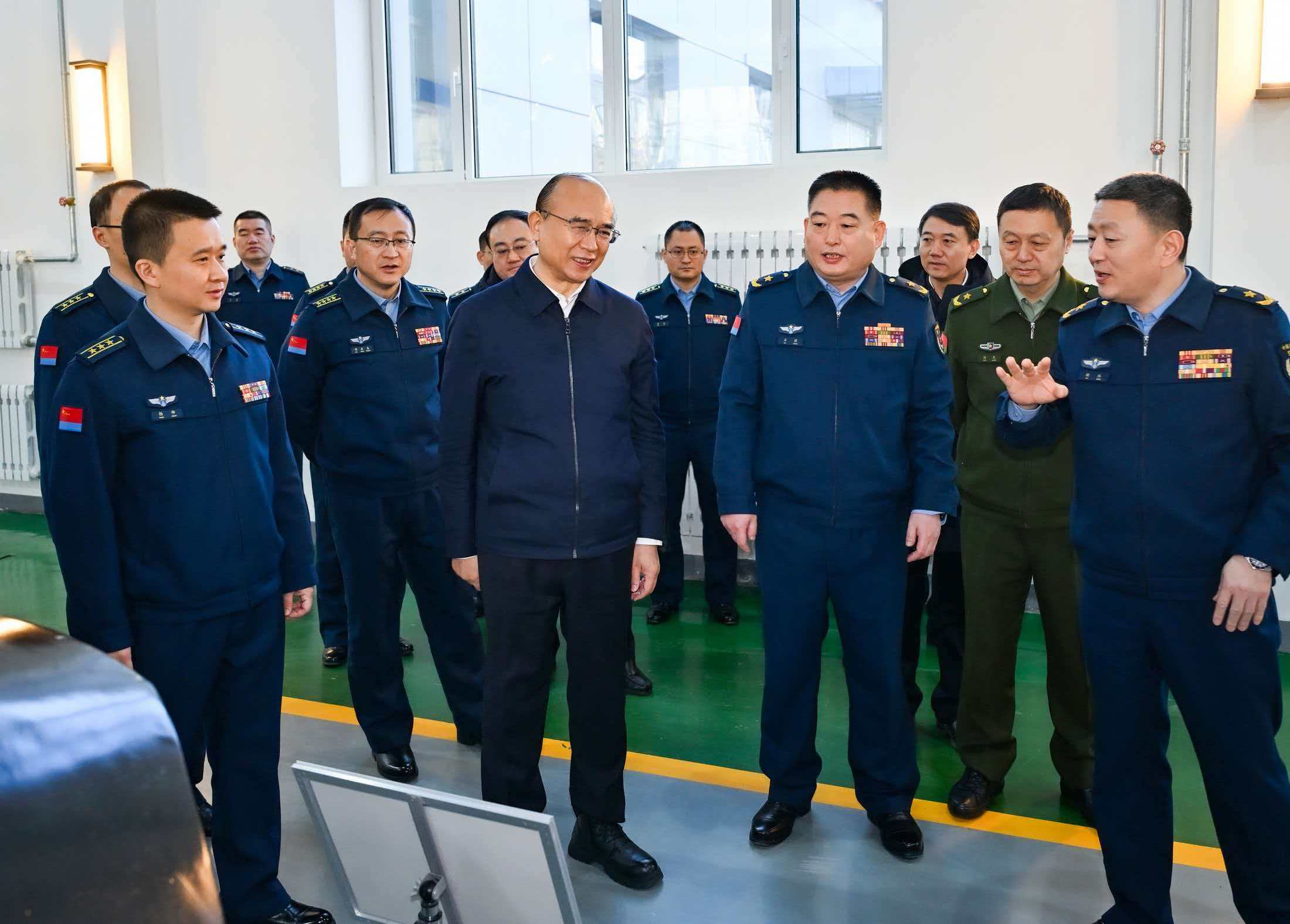在空军哈尔滨飞行学院,许勤参观教学实验室,了解部队日常训练情况,与官兵交流并致以节日祝福。