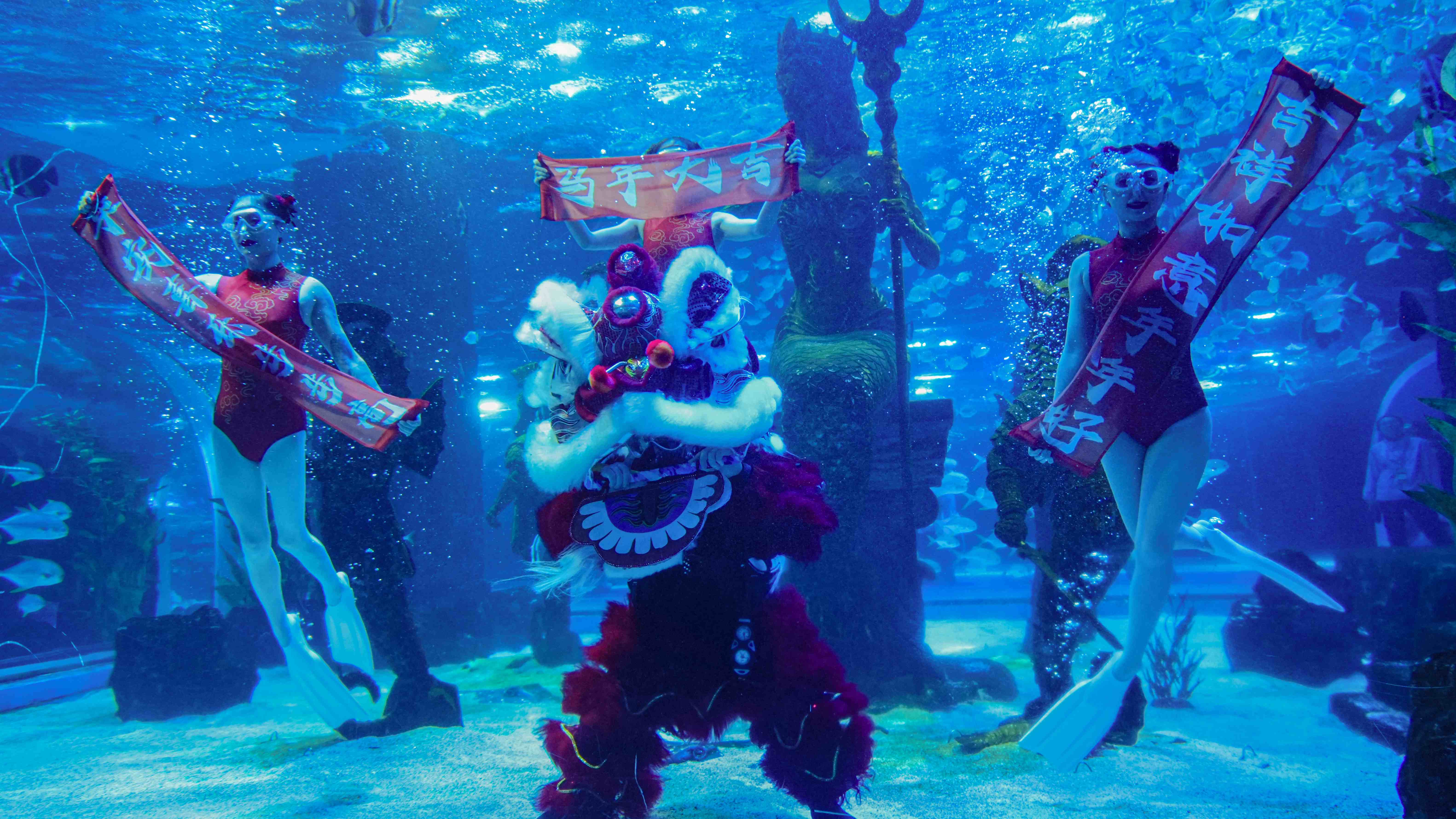 世界首创3D全息光影海豚秀解锁全新新年剧本,特邀国际歌唱家倾情献唱,打造如临演唱会现场的沉浸式视听享受;水舞秀惊喜推出海底舞狮新春限定版,表演者身着国风服饰在水下演绎传统舞狮,刚柔并济的动作将年味习俗与艺术美感完美融合。两大全新大型互动情景表演同步亮相,《冰川回声-新年舞会》集结国内外顶尖艺术家,异域风情歌舞轮番登台,带领游客沉浸式体验热闹的新年派对;《船长的新年宝藏》邀请游客与顶流极地NPC海盗船长趣味互动,解锁沉浸式玩乐新体验,让游客从观众变为深度参与者,尽享新春互动乐趣。