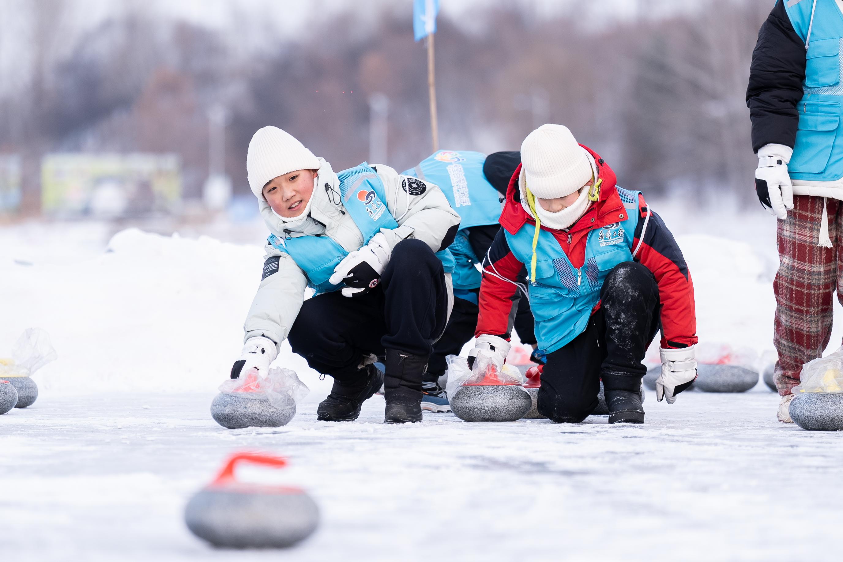 希望与爱手拉手主题公益研学活动中,孩子们玩室外冰壶