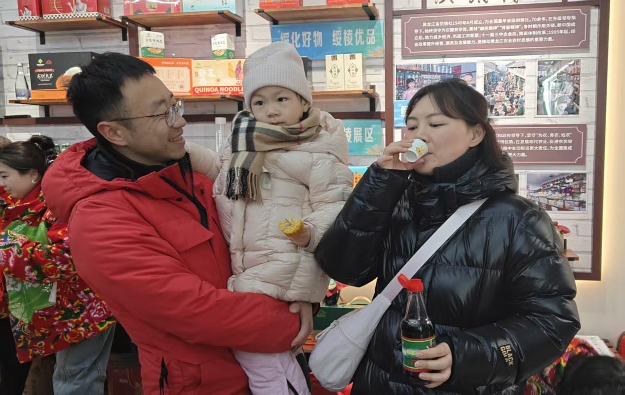 黑龙江网2月14日讯(记者 韩俏) “刚尝了一口螺旋藻米醋,清爽解腻,过年蘸饺子吃味道绝了!”“口感醇厚还带着粮食发酵的自然香,自己吃、送亲友都再合适不过了。”2月14日春节前夕,哈尔滨中央大街“黑龙江省供销社·食趣空间”展厅内人头攒动、喜气洋洋,“甄选绥化好物·邂逅冰城雪韵”暨“绥棱好物”走进冰城专项活动盛大启幕,浓浓的东北年味与火热的消费气息交融碰撞,尽显绥棱好物的独特魅力。