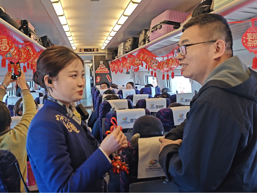 一路欢歌一路情,列车飞驰年味浓。D512次“敖东亲古”民族列车以特色活动传递新春祝福,用暖心服务守护旅客归途,在春运的旅途上书写温情与美好,让每一位旅客都能带着平安与喜悦,奔赴团圆之约。