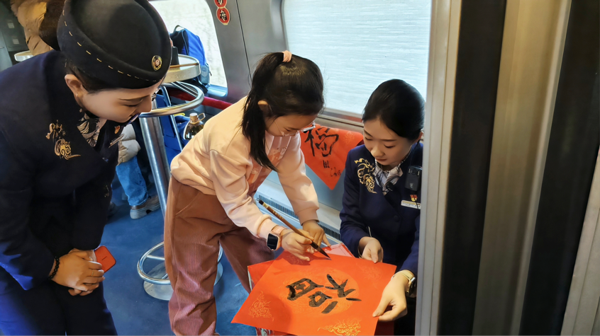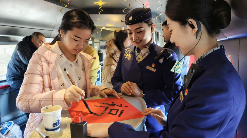 “第一次在火车上参加这样的活动,车厢布置得很漂亮,活动也特别有意思,既能玩游戏、写福字,还能拍照打卡,让原本平淡的旅途变得格外难忘。”旅客王先生开心地说道,乘务人员贴心周到的服务和用心筹备的活动,让大家在回家路上就感受到了春节的温暖与喜悦。