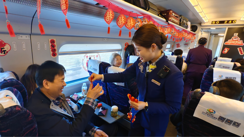 为营造浓厚的节日氛围,乘务人员提前对列车车厢进行了装饰。红彤彤的窗花贴满车窗,喜庆的拉花与特色挂饰点缀车厢各处,精心打造的新春打卡墙醒目亮眼,一踏入车厢便能感受到扑面而来的新春气息。列车平稳开行后,丰富多彩的互动活动正式开始,列车长赵佳月带领班组乘务人员与旅客热情互动,现场气氛热烈非凡。