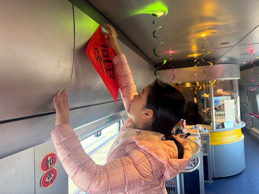 随后,亲笔写“福”活动在餐车温馨开展。乘务组提前备好笔墨纸砚,邀请旅客现场挥毫泼墨,亲手书写福字。大家满怀兴致提笔书写,一笔一画间饱含着对新年的美好期盼,一张张饱含心意的福字铺满桌面,墨香与年味相融,成为列车上一道温暖的风景。旅客们纷纷将亲手写下的福字收好,把这份来自旅途的福气带回家。