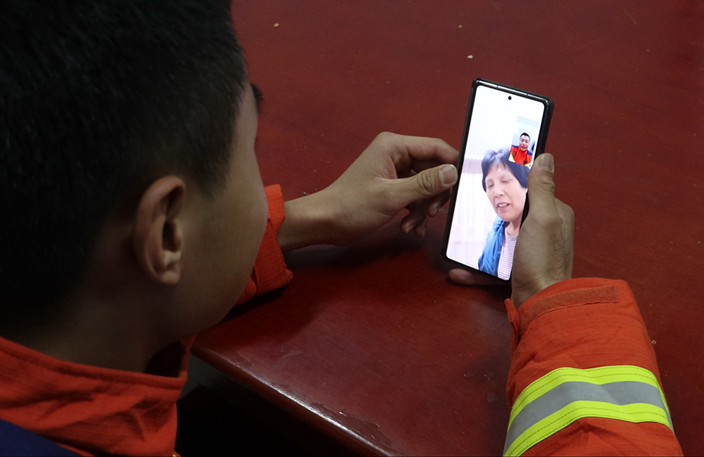 “妈,今年春节我就不回家过年了,您别担心,等忙完这阵我就回去看您。”电话这头,许瑞博的声音温柔而坚定,他深知,自己的坚守能让更多家庭在这个新年里团圆美满。休息间隙,许瑞博通过视频连线与家人通话。