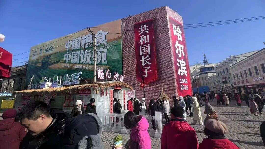 春晚镜头中,“黑土优品•北大荒”暖心冰屋以松花江天然冰块搭建,暖黄灯光与冰雕质感相互交融,游客手持热饮、笑意盈盈的画面,传递出冰城独有的温暖烟火气,瞬间圈粉亿万观众。春晚播出后,“黑土优品•北大荒”暖心冰屋迅速成为游客必打卡的“春晚同款”地标,线下客流迎来爆发式增长。正月初一至初二,日均接待游客超1万人次,较春晚前日均客流提升3倍,冰屋前打卡拍照、体验试吃的队伍络绎不绝。