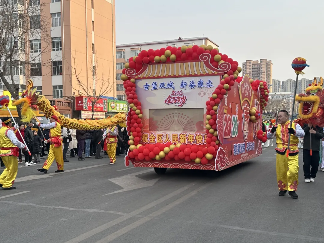 巡游队伍中,装饰着大红灯笼、中国结和“古堡双城 新姿雍容”标语的主题音响花车格外醒目,它一路奏响激昂欢快、极具地域特色的东北风情乐曲,为整场巡游奠定了热烈奔放、喜气洋洋的基调。
