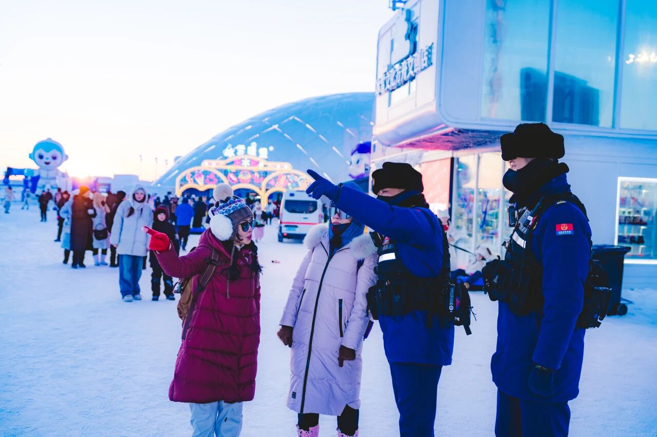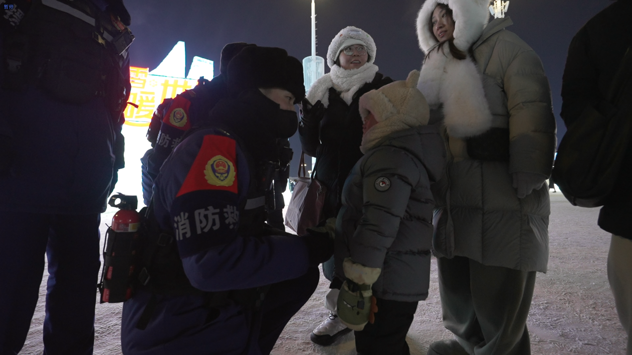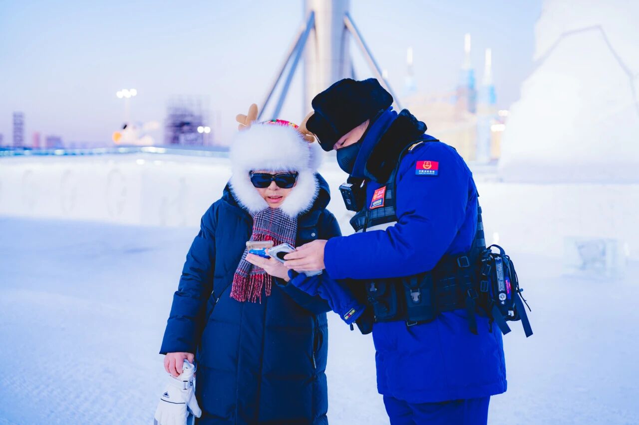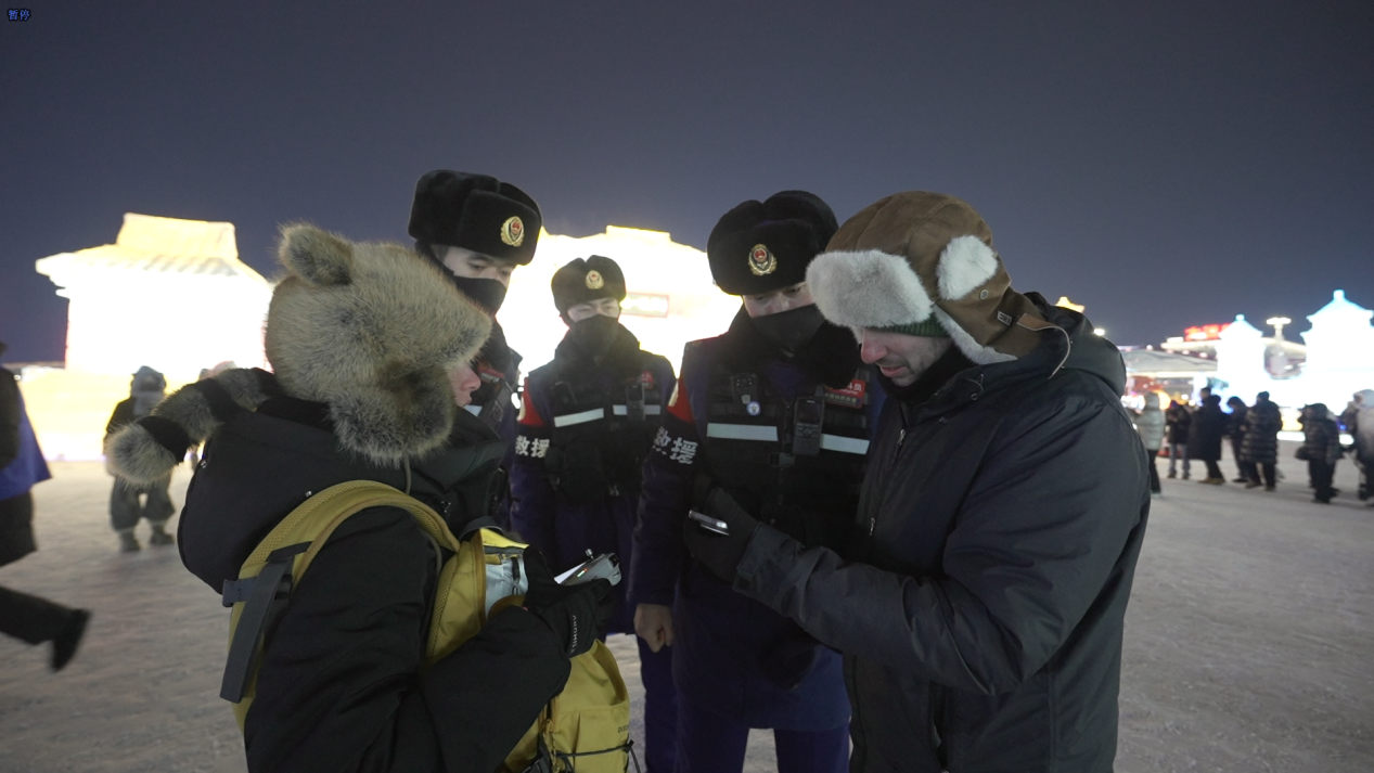她和同伴都是广西的大学生,第一次远行,就选择了哈尔滨。白天一起玩了大滑梯,晚饭后一转身,就走散了。我们立刻联系园区广播,很快,两个姑娘在消防驿站重逢。看她们手脚有些轻微冻伤,我们拿来了冻伤膏。聊天中,“谢谢” 两个字,她们说了一遍又一遍。