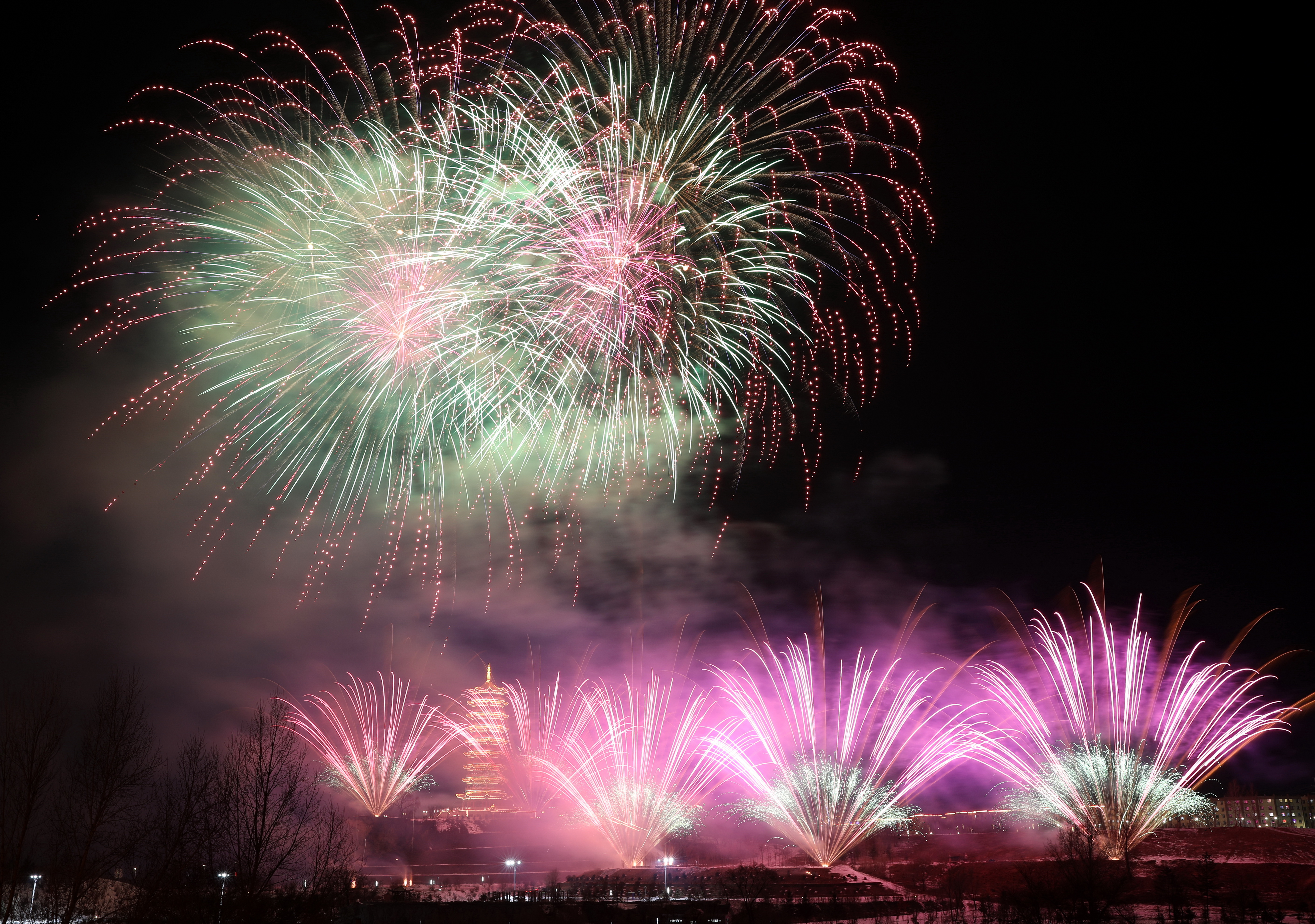 烟花燃放活动分为喜迎新年·福润鹤岗、七彩祥云·瑞罩兴安、盛景华章·情满煤城、展望未来·奋进鹤岗四个篇章。伴随着一声声震彻长空的礼炮响,第一簇金色焰火腾空而起,在夜空中绽放出耀眼光芒,高空礼花次第升空、竞相绽放,红牡丹、七彩祥云、锦冠瀑布等造型轮番登场。璀璨焰火与平安塔、城市楼宇灯光相映成趣,勾勒出鹤岗夜色的灵动与壮美,将元宵之夜的浪漫与热烈推向高潮。