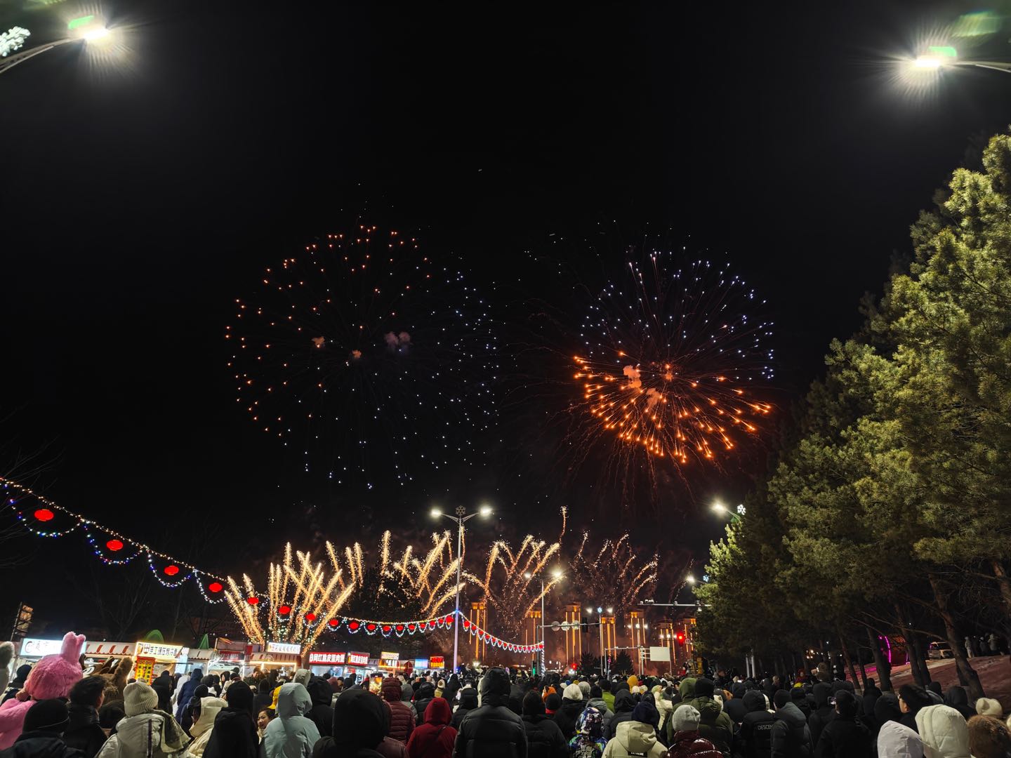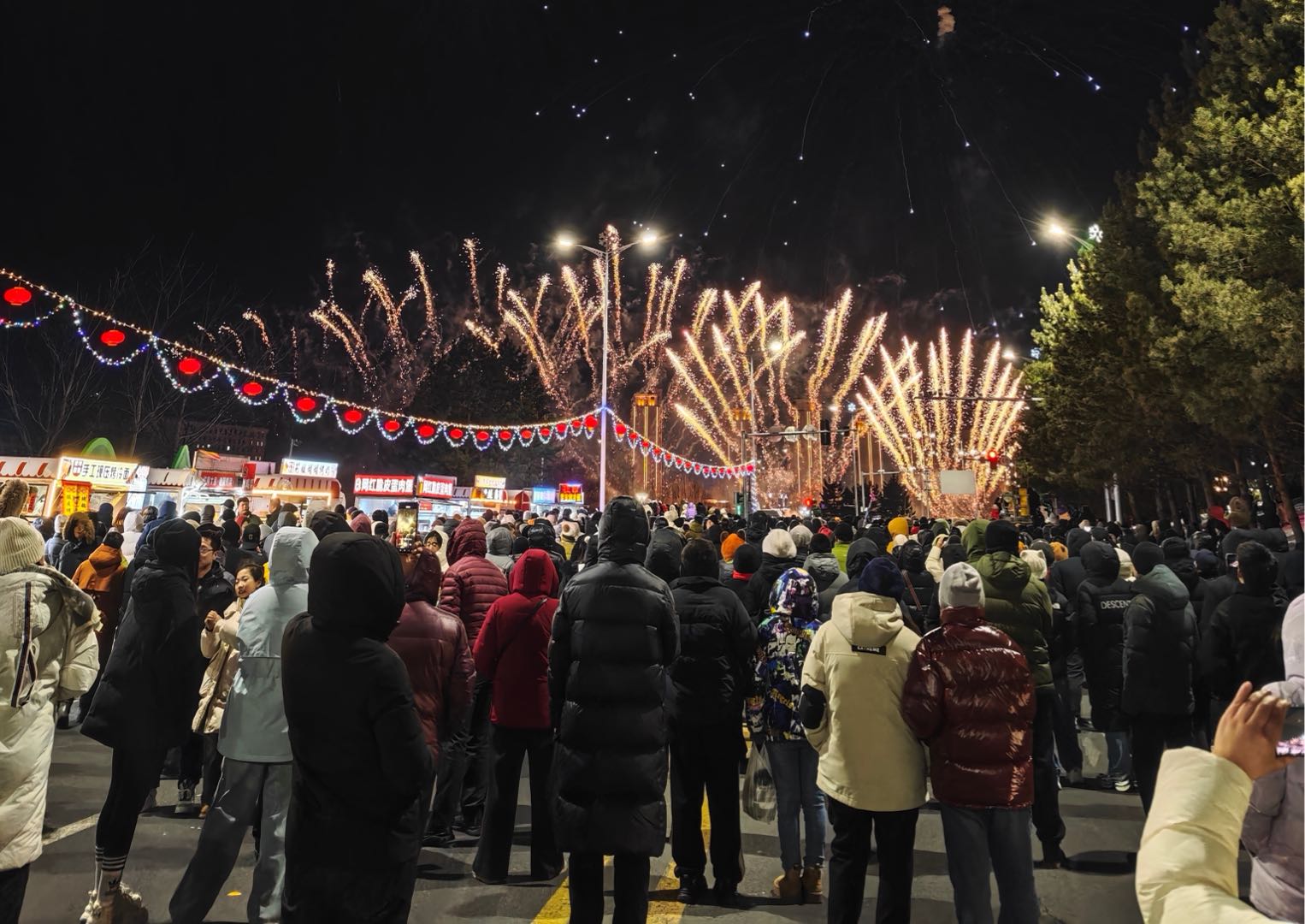 随着第一束焰火绽放,大家期待已久的特色烟花秀正式登场。一束束绚烂的烟花直冲云霄,漆黑的夜空瞬间被点亮。匠心独运的烟花造型轮番绽放,如耀眼繁花般铺满天际,五彩斑斓的烟火映照着大家幸福的脸庞,勾勒出一幅绝美的冬日元宵画卷。现场观众纷纷拿出手机,记录下这美好的瞬间,欢呼声、惊叹声与烟花绽放声交织在一起,将节日的氛围推向高潮。