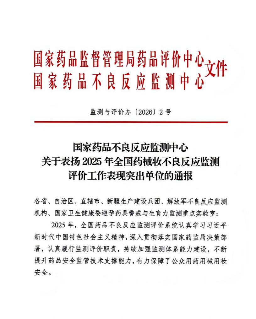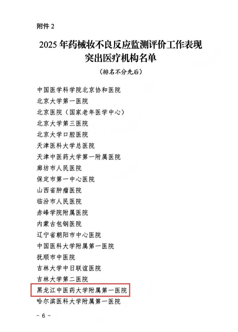 近日,国家药品监督管理局药品评价中心、国家药品不良反应监测中心正式发布《关于表扬2025年全国药械妆不良反应监测评价工作表现突出单位的通报》。黑龙江中医药大学附属第一医院凭借高效运行、科学完善的监测体系,以及扎实过硬的专业评估能力与科学精准的分析方法,荣获2025年全国药械妆不良反应监测评价工作表现突出单位荣誉称号,标志着我院在药品安全性监测与评价领域的工作已跻身全国先进水平。