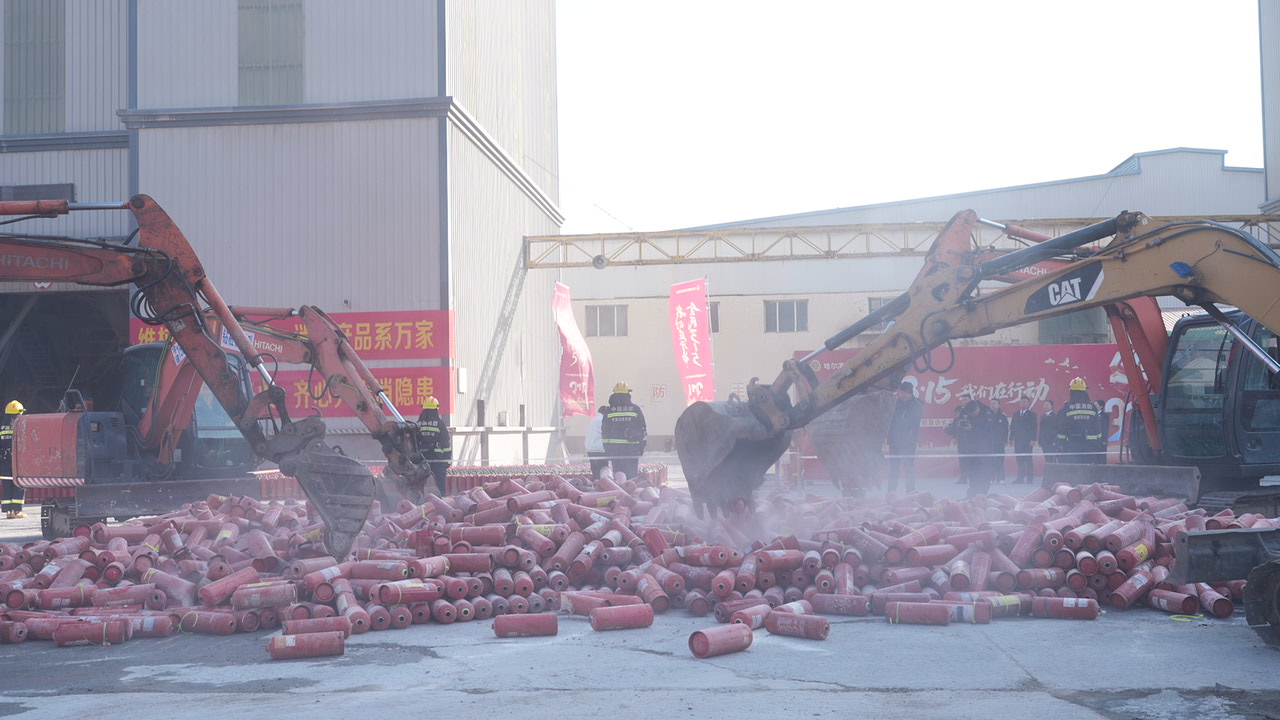 在主题宣传活动的分会场,哈尔滨市消防救援局在室外露天广场举行2026年度不合格灭火器集中销毁仪式,消防救援人员对2025年在全市监督检查中发现和收缴的不合格灭火器进行了集中展示,涉及劣质灭火器8011具。